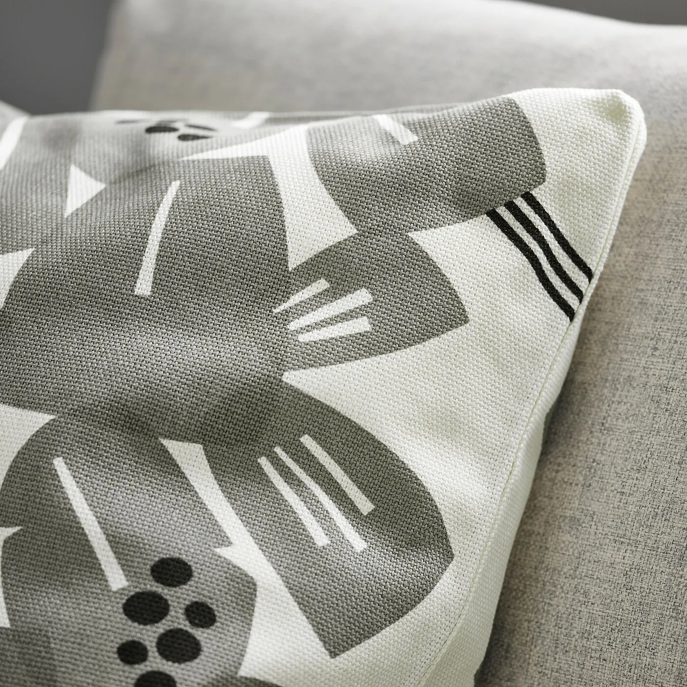 Эта наволочка в белом и светло-серо-зеленом цветах создает радостное настроение благодаря узору из игривых листьев, танцующих на ветру. Плотная ткань из хлопка и джута, а также скошенные углы формируют квадратную форму.