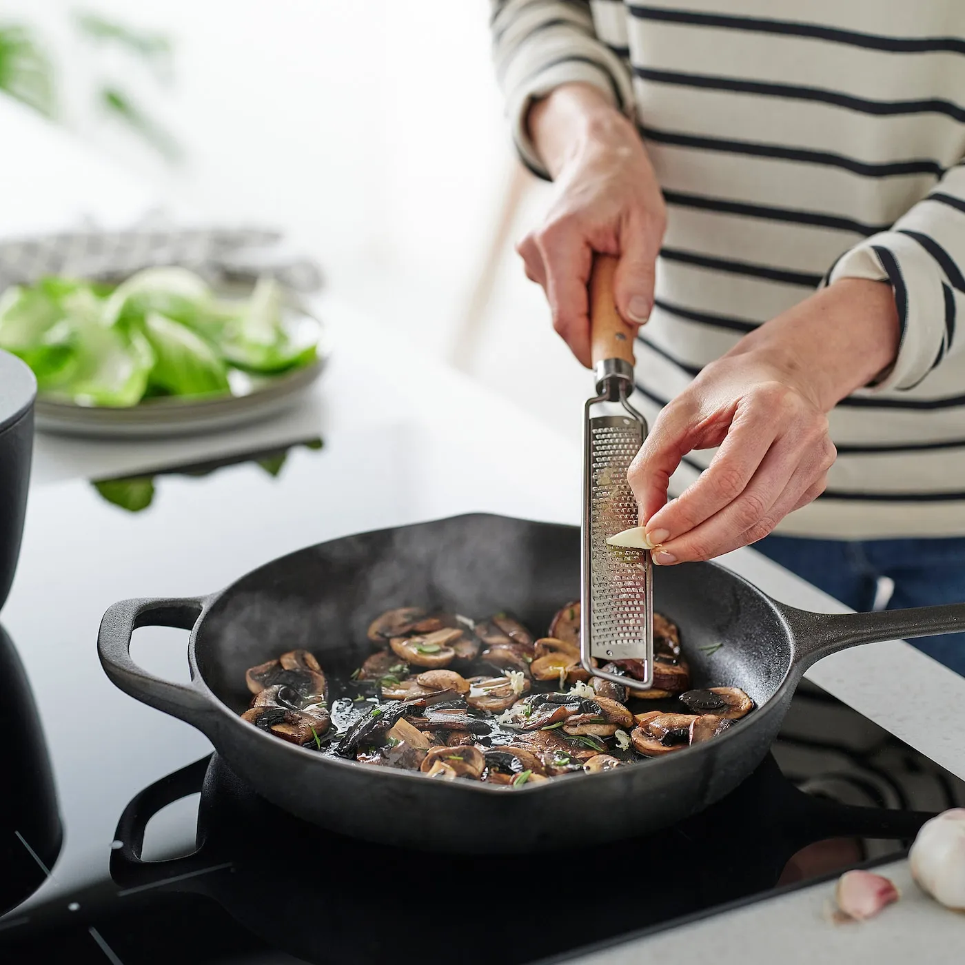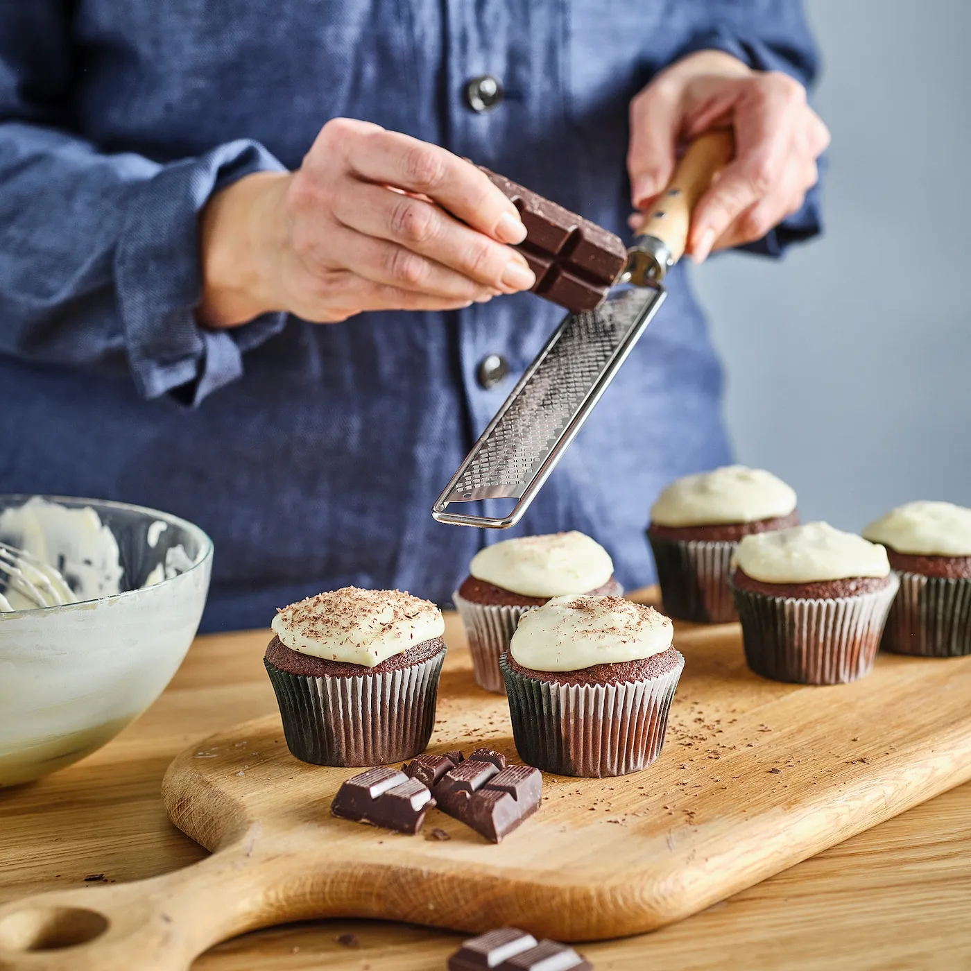 У этого цестера прочная деревянная ручка, которая облегчает натирание цедры с цитрусовых или добавление пармезана в пасту. После приготовления пищи можно повесить цестер за отверстие в ручке.