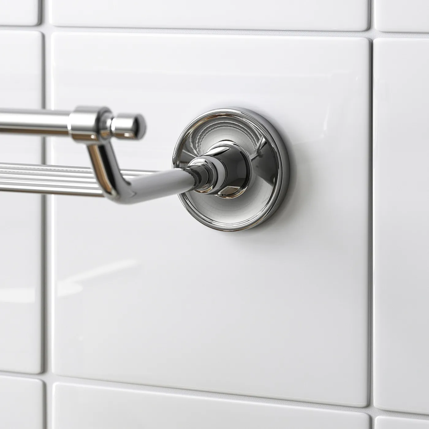 Аксессуары для ванной BROFJÄRDEN с блестящими хромированными деталями напоминают о шикарных, проверенных временем дизайнах прошлого. Эта настенная полка хранит мыло и крема в порядке и доступности рядом с раковиной.