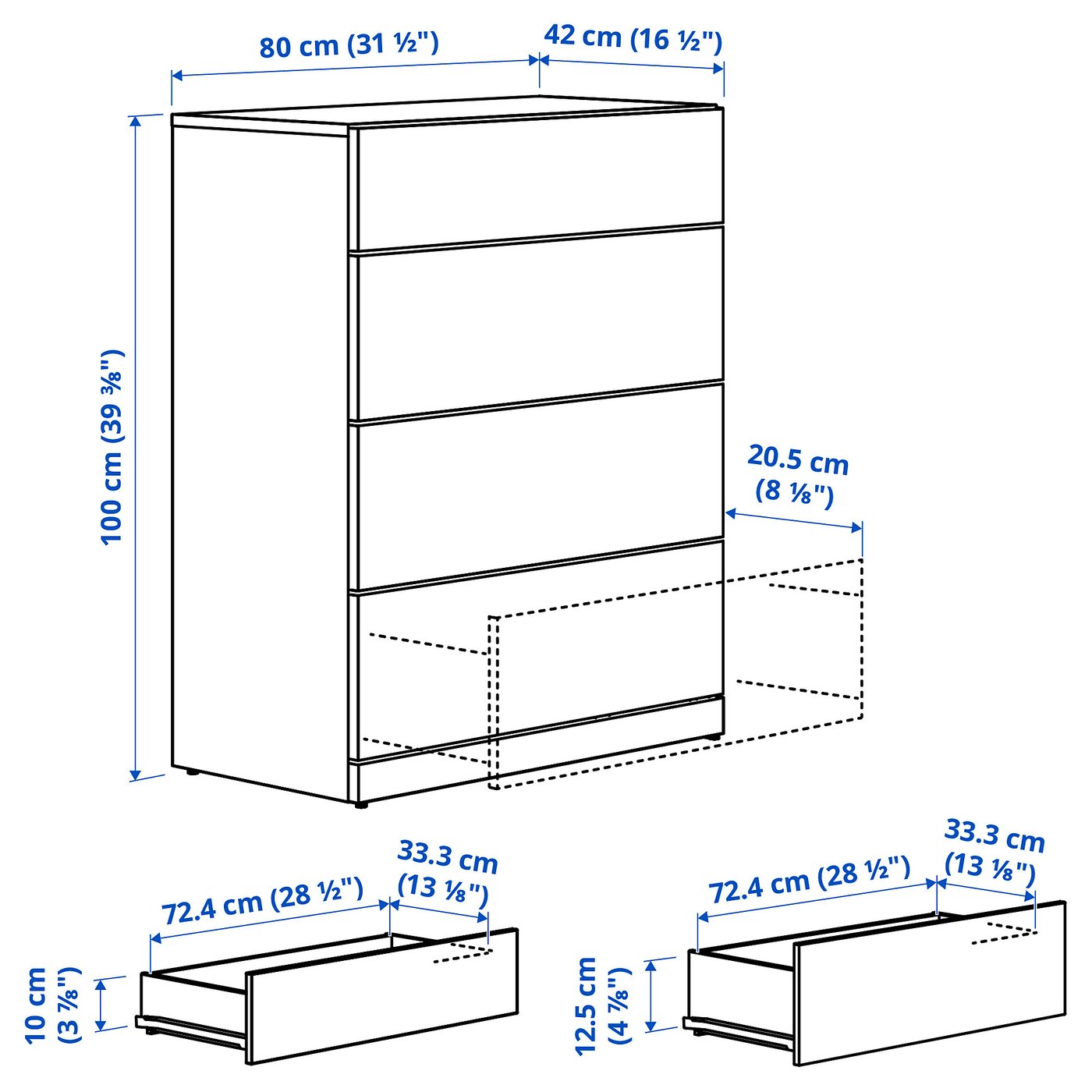 Держите комод LASTARE в порядке с помощью коробок. Для ширины 80 см: 4 коробки STUK с отделениями 17x32x10 см, или 1 коробка STUK с отделениями 32x51x10 см и 1 коробка STUK с отделениями 17x32x10 см.