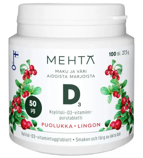 Состав: подсластитель (ксилит), холекальциферол (витамин D), порошок брусничного сока (брусничный Vaccinium vitis-idaea, мальтодекстрин), эмульгатор (магниевые соли жирных кислот).
