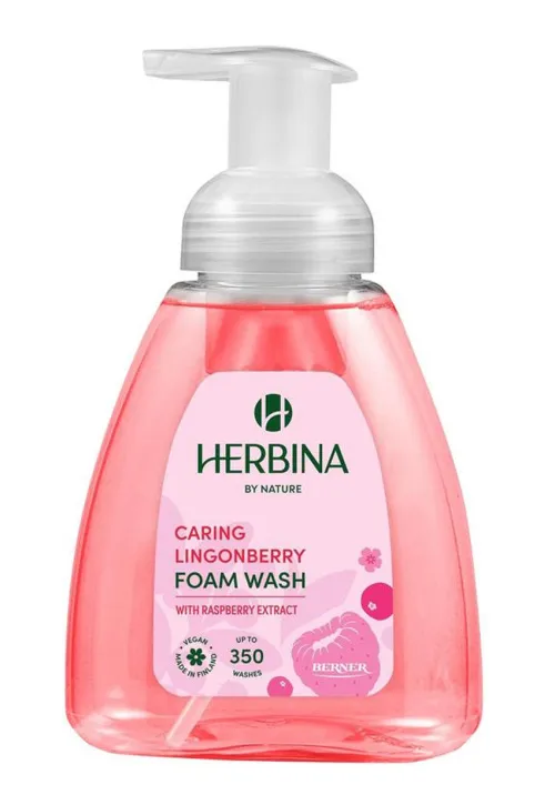 Нежное и щедрое мыло-пенка Herbina Caring Lingonberry подходит для ежедневного мытья рук и тела всей семьей.