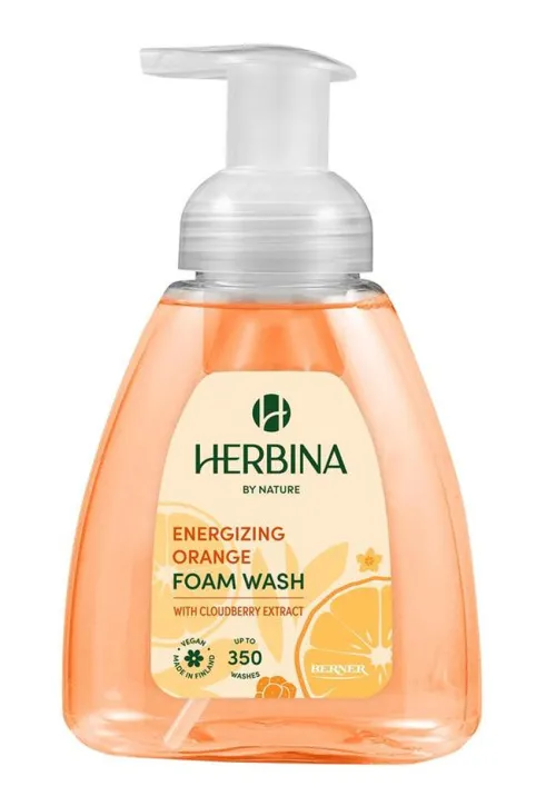 Нежное и щедрое мыло-пенка Herbina Energizing Orange подходит для ежедневного мытья рук и тела всей семьей.