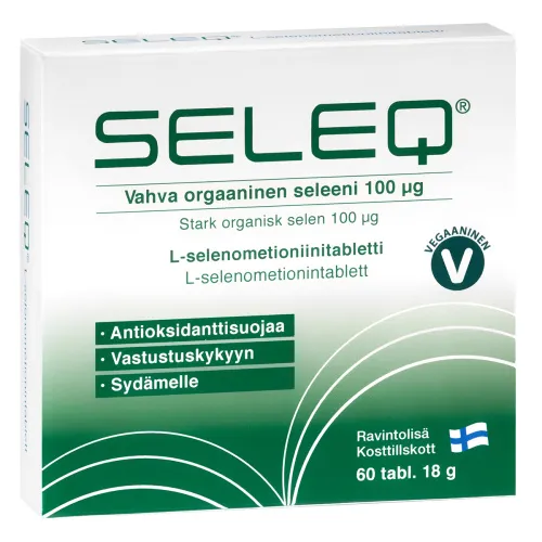 Не содержит ингредиентов животного происхождения, лактоза, сахар, дрожжи или глютен Размер упаковки: 60 табл. / 18 г Состав: антикомкователь E 460 , кукурузный крахмал, L-селенометионин, поверхностный стабилизатор E 470b Дозировка: 1 таблетка в день. Суточная доза 1 табл. Содержит: 100 мкг селена * * 182% от контрольной суточной нормы. Страна производитель: Финляндия.