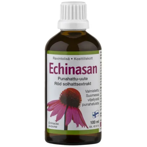 При внутреннем употреблении эхинацея поддерживает естественную иммунную сопротивляемость. Это отличное подспорье для людей, страдающих ангиной, ринитом или кашлем. Наружно его применяют для обработки небольших ран. Кроме того, его можно использовать, например, в случае прыщей и укусов насекомых. Эхинасан - это финский 100% экстракт эхинацеи, который употребляют в разбавленном виде.