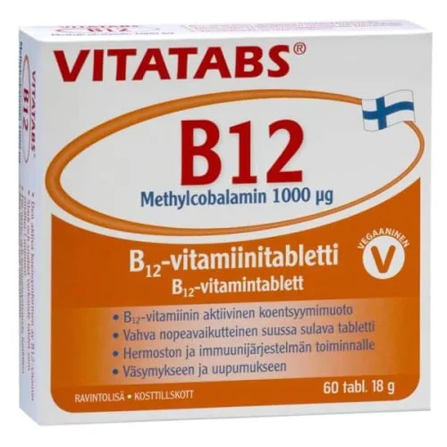 Витамин B12 Vitatabs ® B12 Метилкобаламин 1000 мкг, 60 табл.Быстродействующая таблетка с высоким содержанием витамина рассасывается во рту.Метилкобаламин — это активная коэнзимная форма витамина B12.Поддерживает нервную и иммунную системы, а также снижает усталость и утомление.Особенно рекомендуется пожилым людям и вегетарианцам.Дневная доза:1 таблетка содержит:метилкобаламин, содержание витамина B12 1000 мкг.