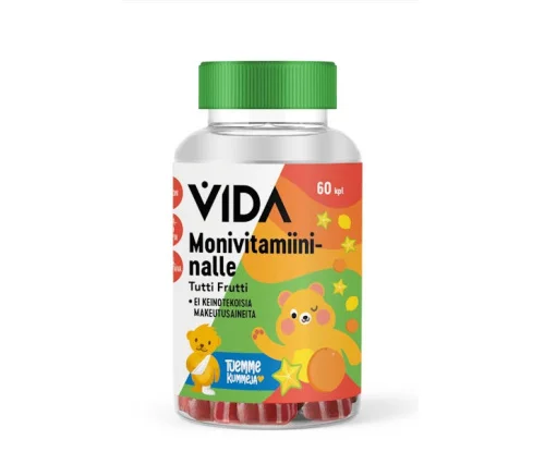 Vida Мультивитаминные мишки Tutti Frutti содержат девять витаминов и цинк в мягкой жевательной форме. Без сахара. Подходят для всей семьи, начиная с 3 лет.