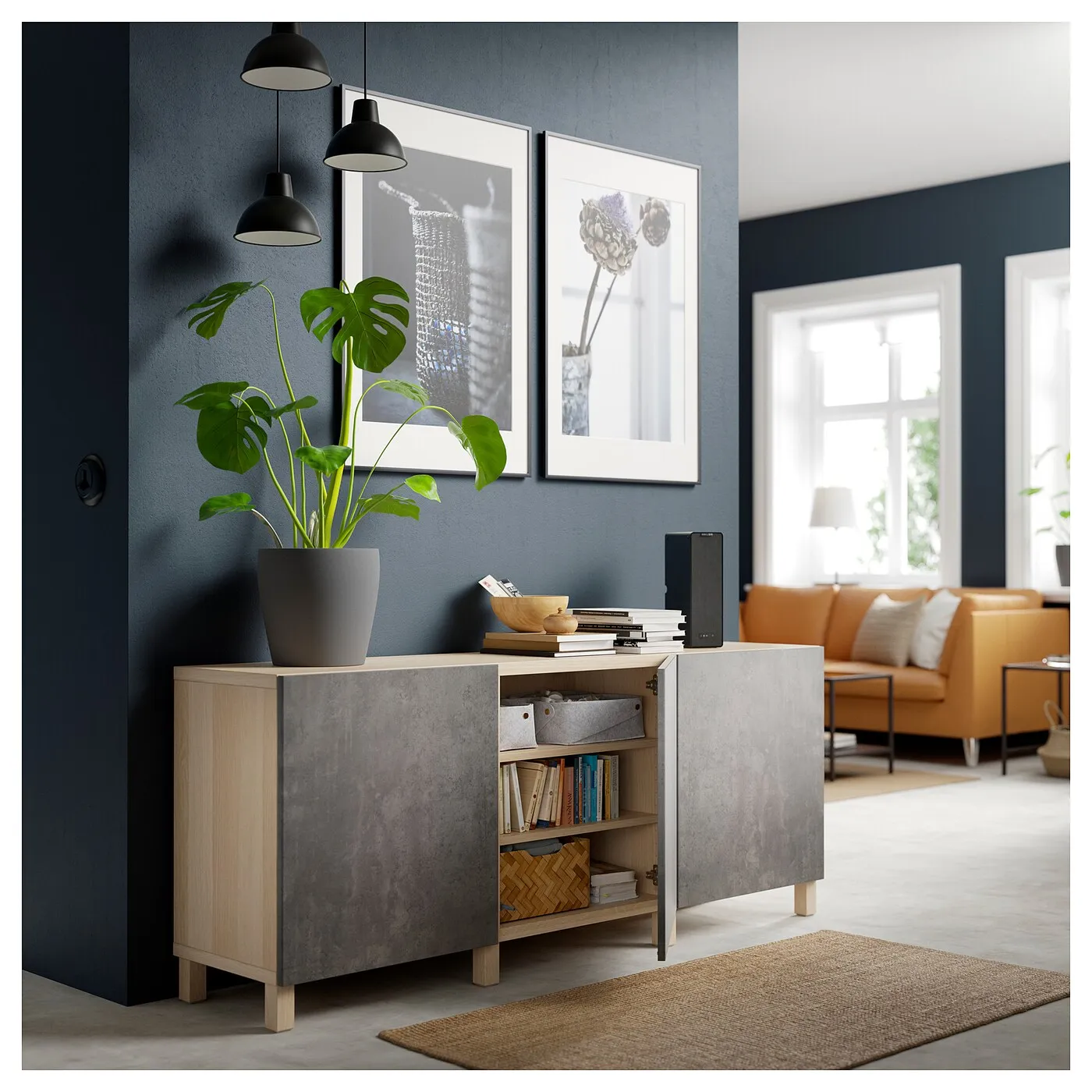 Эта комбинация состоит из нескольких отдельных элементов. Используйте верхнюю панель BESTÅ, продается отдельно, чтобы закрыть стык между рамами и создать однородный вид.