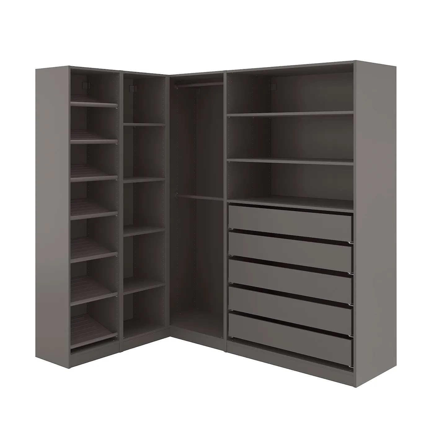 Удачные комбинации позволят разместить вместительный шкаф даже в небольшой угловой зоне. Два варианта глубины каркаса обеспечивают больше места перед решением, а различные внутренние органайзеры помогут разместить все необходимое.