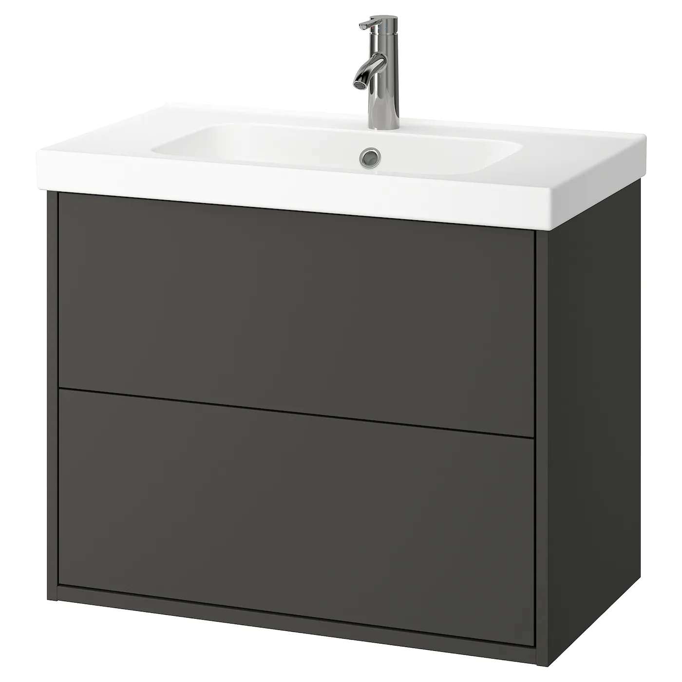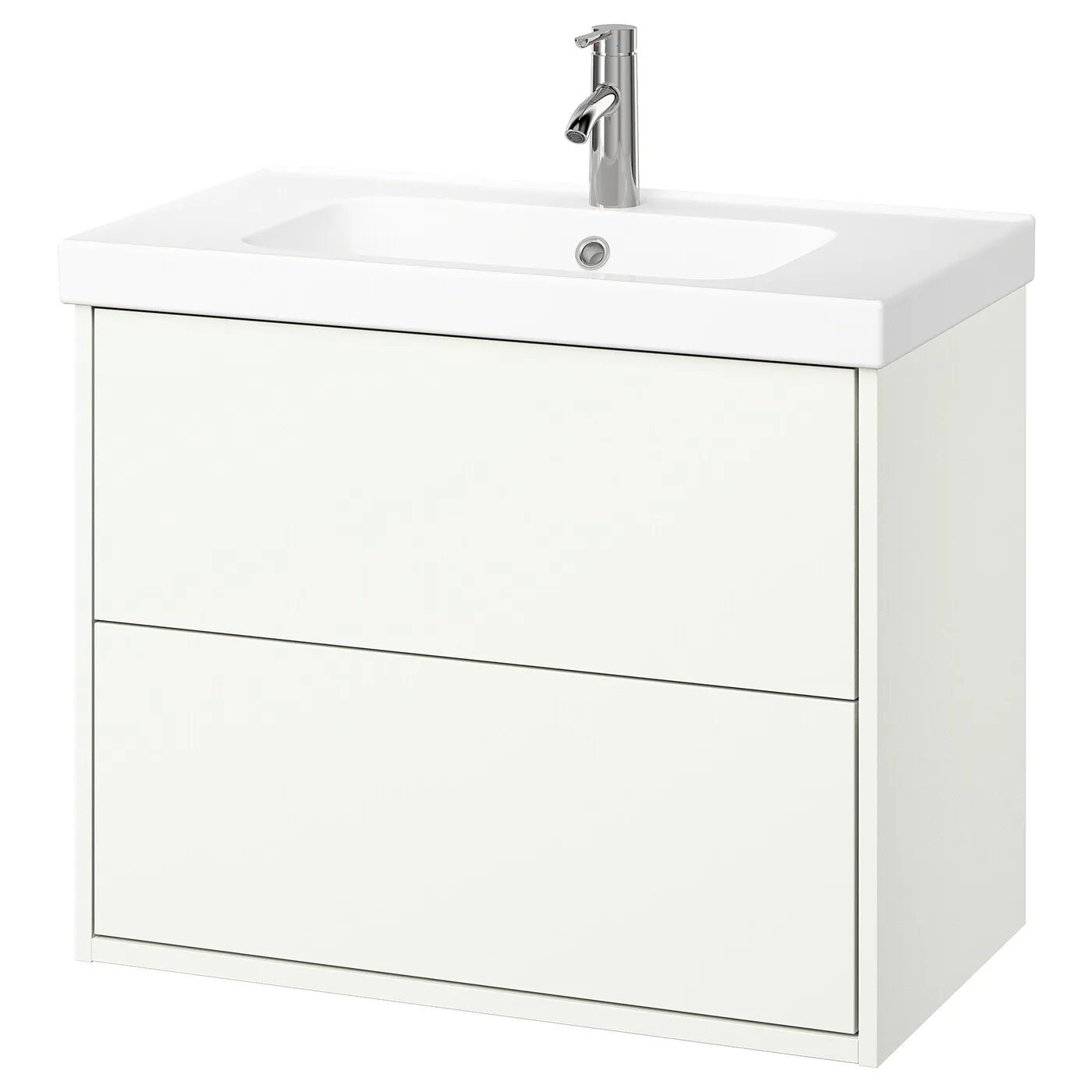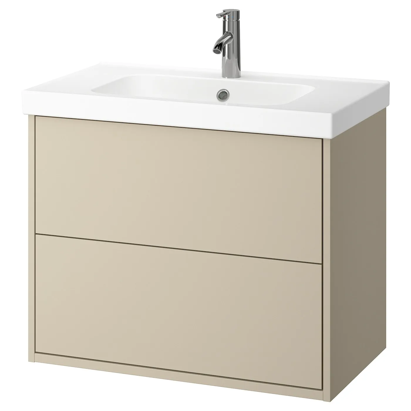 Мебель для ванной HAVBÄCK отличается лаконичным дизайном, который легко можно персонализировать с помощью ручек. Этот комплект включает два вместительных ящика и место на раковине для зубной щетки и мыла.