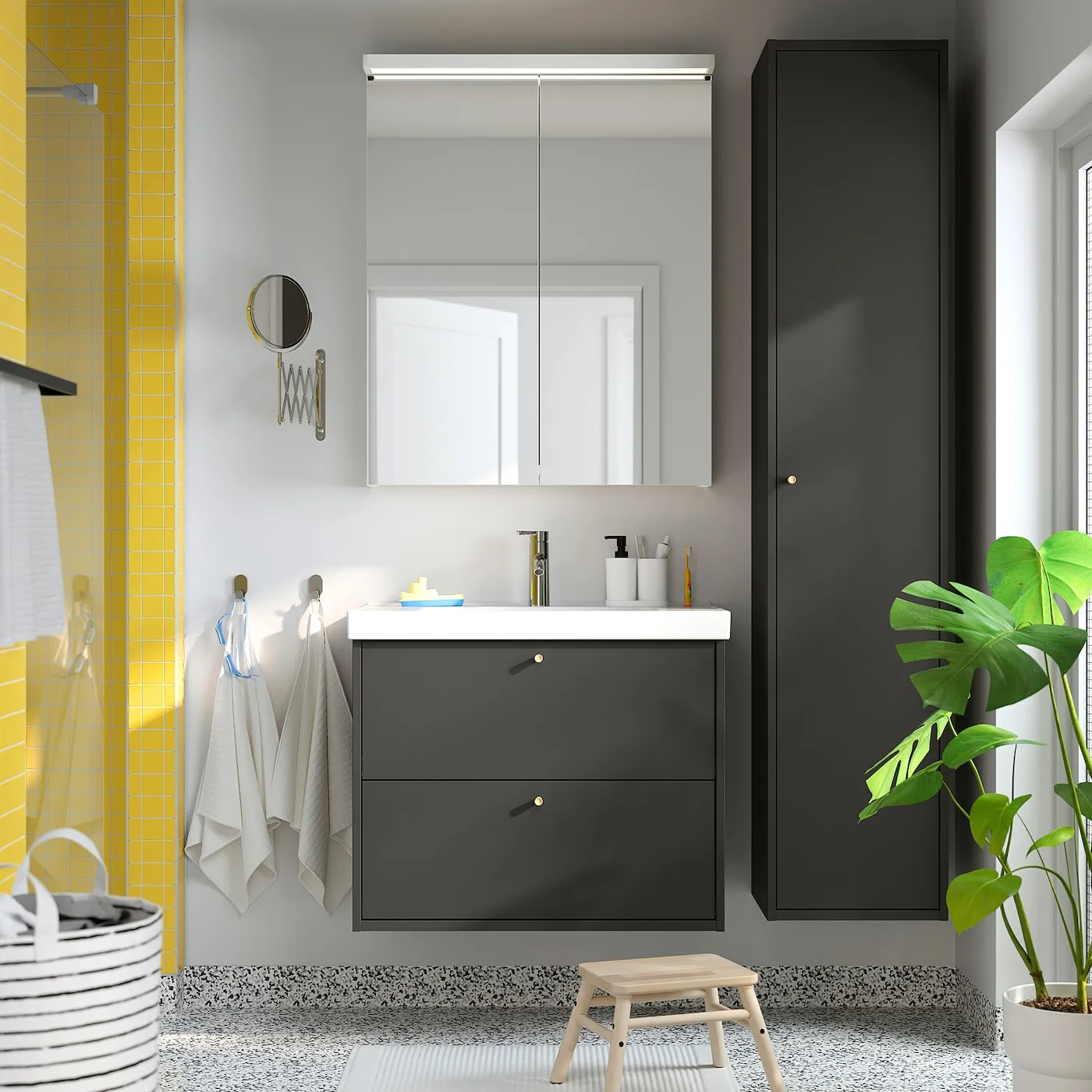 Простой дизайн в матовом темно-сером цвете придаст вашей ванной уверенный и спокойный вид, который легко изменить с помощью выбранных вами ручек.