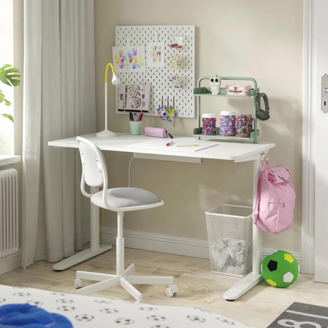 Простой и функциональный стол с ящиками для ручек и мелочей, а также крючком для рюкзака или наушников идеально подойдет для организации пространства для учебы и увлечений.
