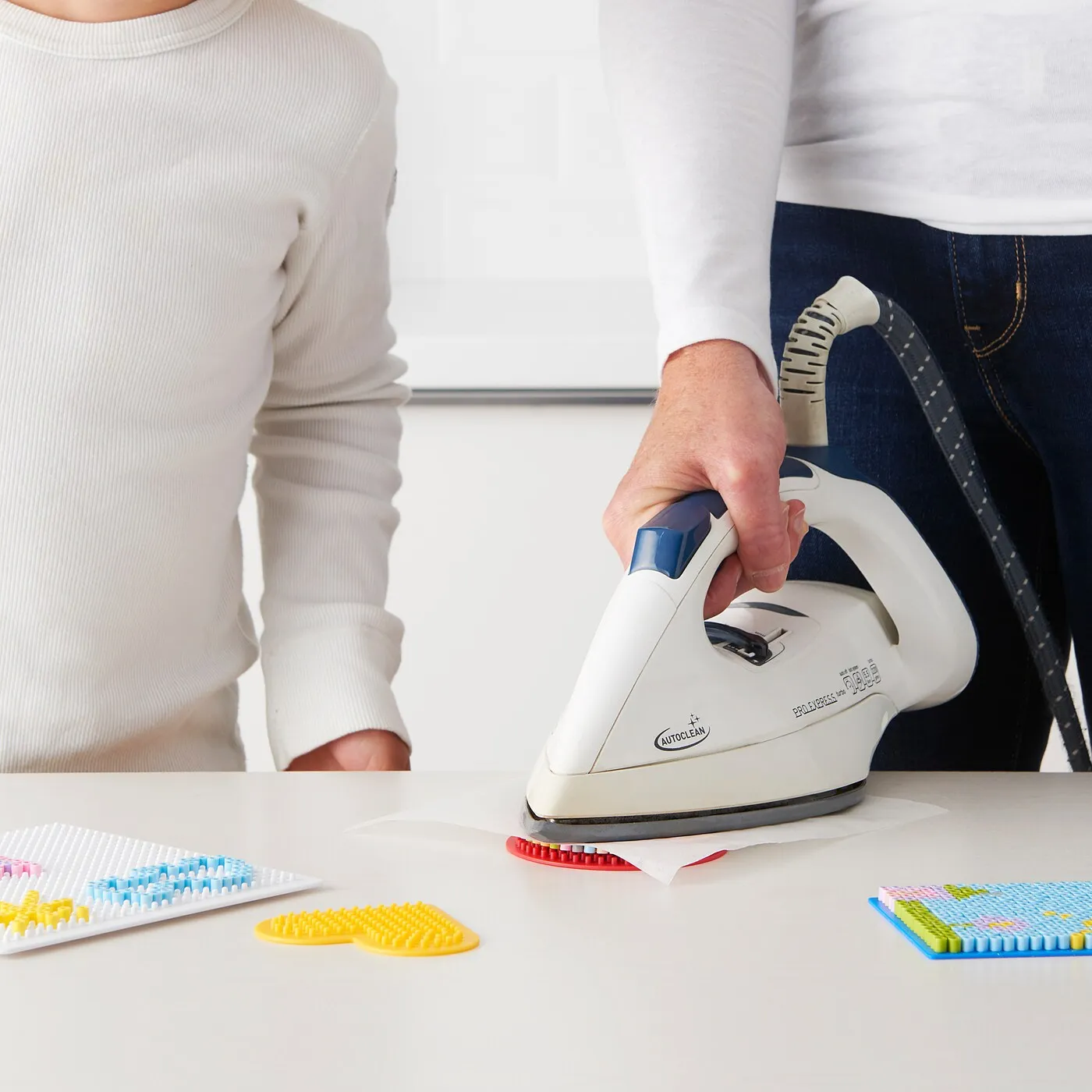 Когда ваш узор будет готов, накройте бисер пекарской бумагой и прогладьте его утюгом, установленным на среднюю или высокую температуру, на несколько секунд, чтобы бисер расплавился и соединился.