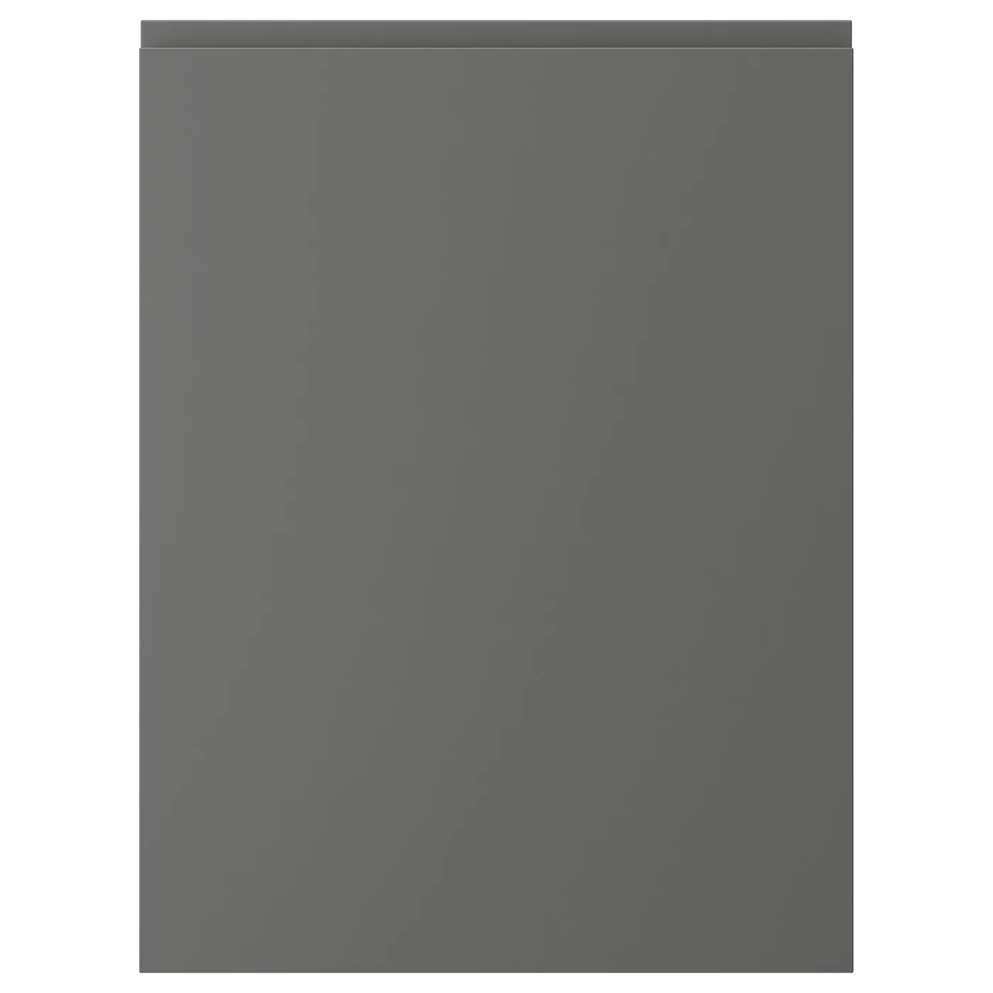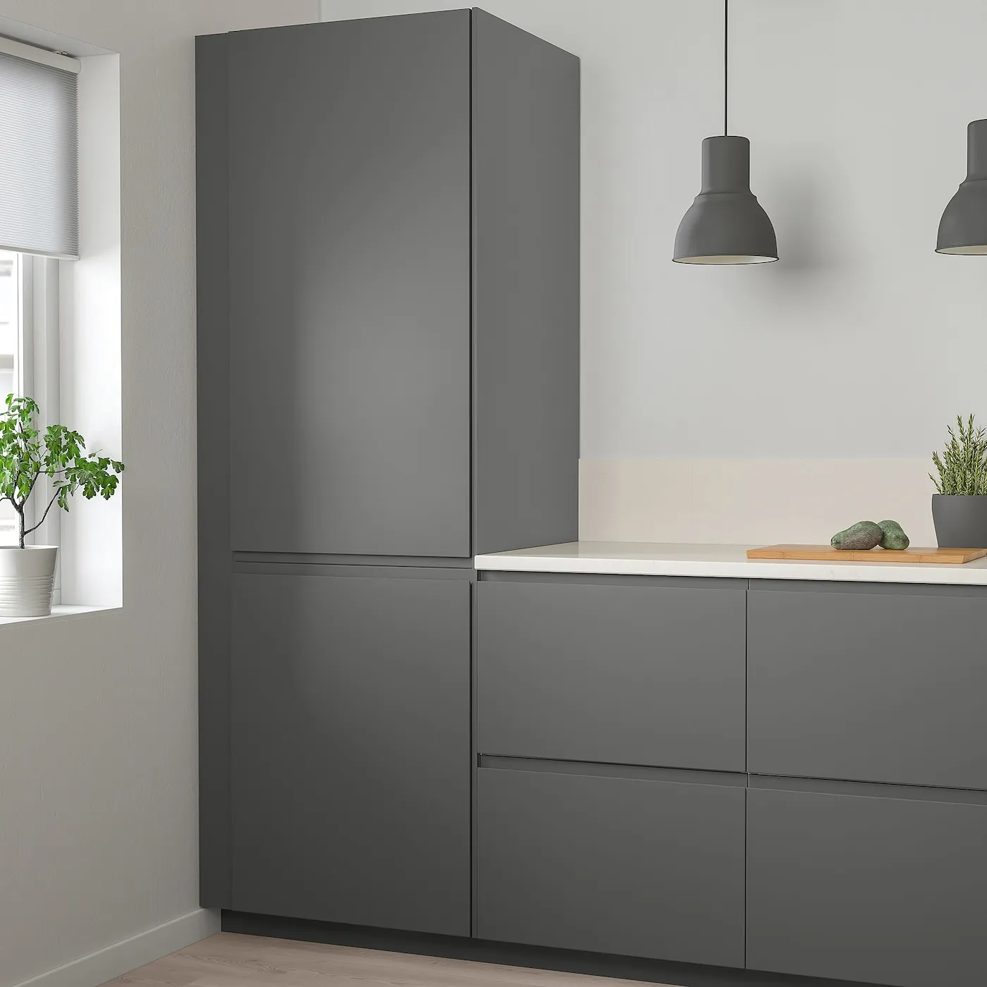 Фасады VOXTORP с матовой поверхностью темно-серого цвета и четкими линиями создают современный вид, который смотрится тепло и успокаивающе. Встроенные ручки идеально вписываются в дизайн, подчеркивая минималистичный стиль.