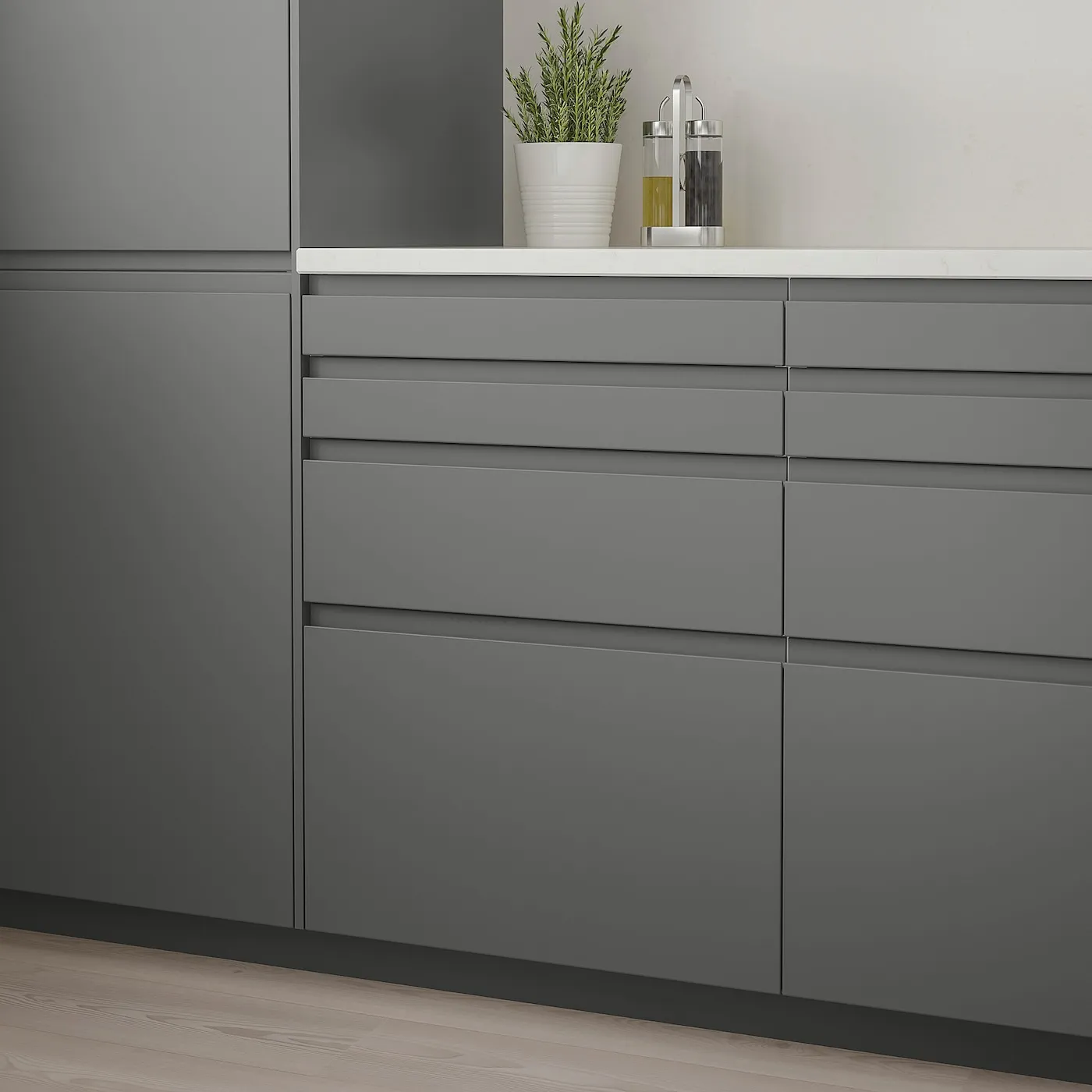 Фасады VOXTORP с матовой темно-серой поверхностью и четкими линиями придают современный стиль, который создает ощущение уюта и спокойствия. Встроенные ручки идеально вписываются в дизайн, подчеркивая минималистичный вид.