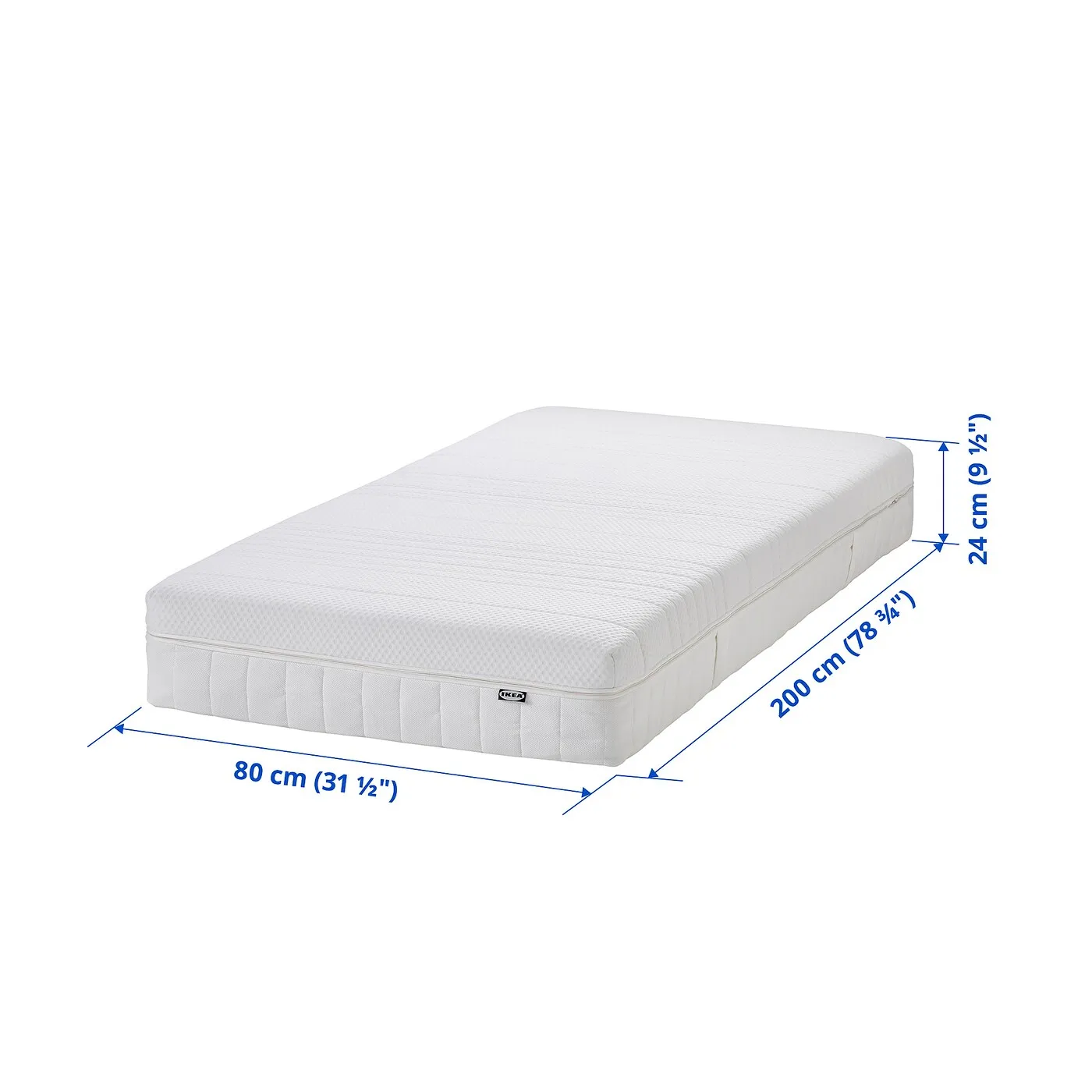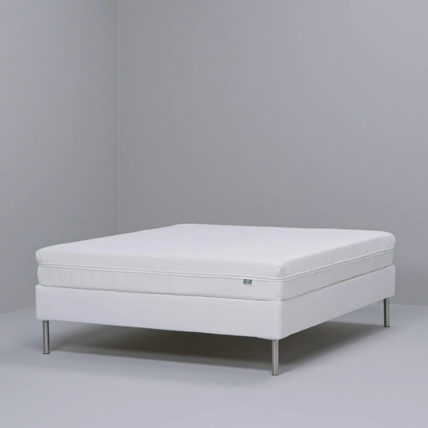 Жесткий гибридный матрас высотой 24 см. Пена с эффектом памяти в сочетании с высокоэластичной пеной, слоем пружин с независимой упаковкой и специальными зонами комфорта для равномерного распределения веса тела — плюс мягкий съемный чехол, который можно стирать.