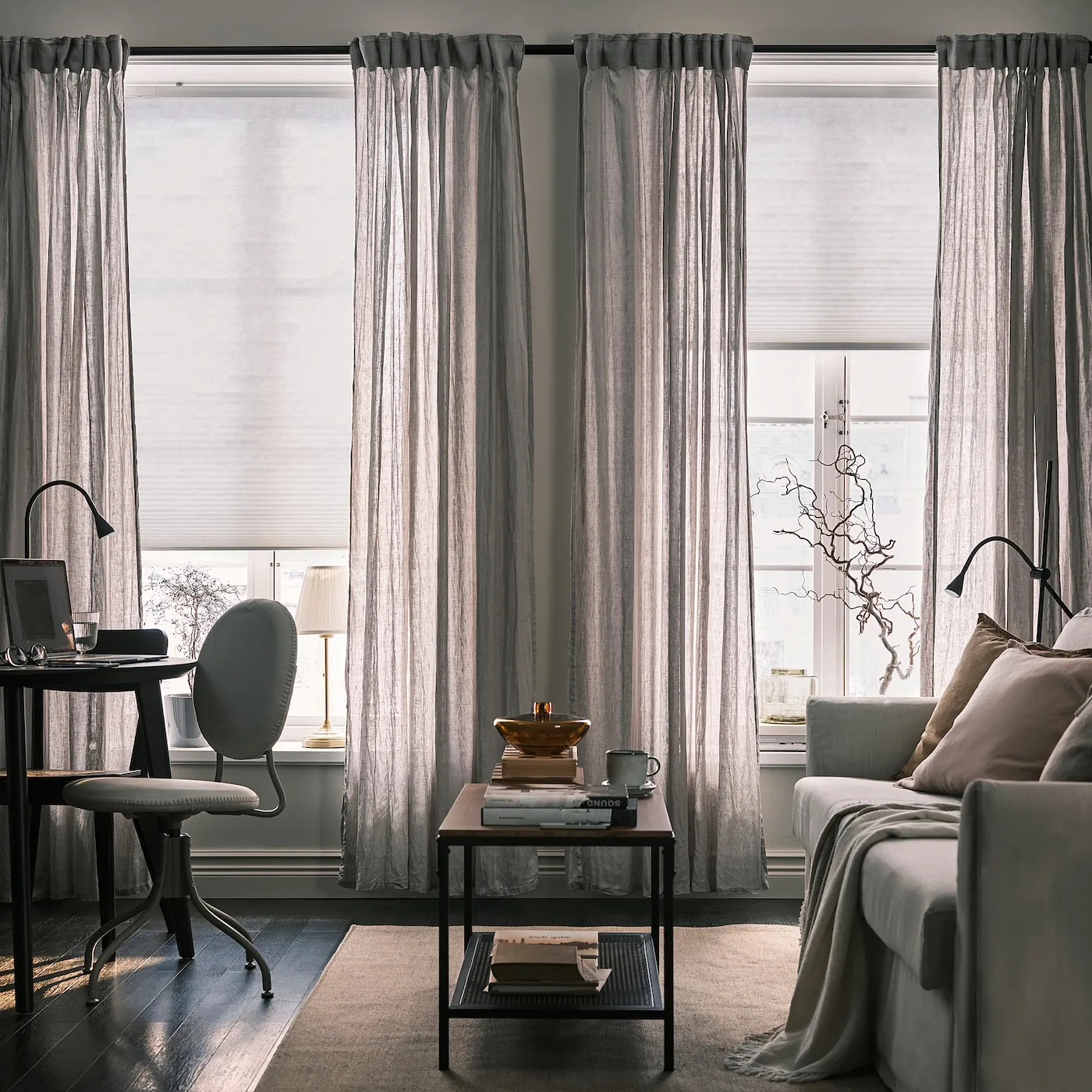 PRAKTLYSING - эта штора фильтрует свет, защищает от сквозняков и палящего солнца. Управляйте с помощью пульта или подключите к хабу DIRIGERA и приложению IKEA Home smart для расширенного контроля.