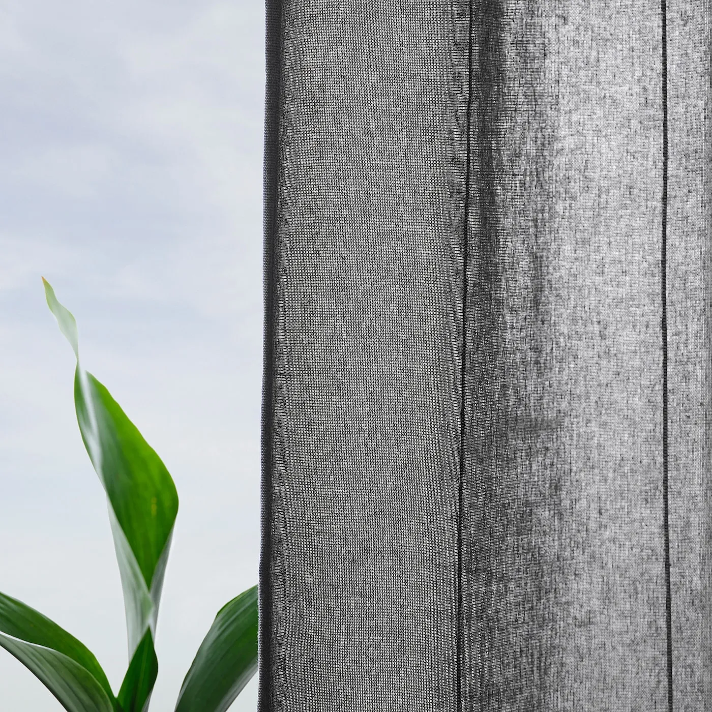 Шторы LENDA в темно-сером цвете с лентой-шторной лентой имеют линейное плетение, которое добавляет характер и визуально увеличивает высоту окна. Подхваты создают декоративный акцент, открывая вид за окном.