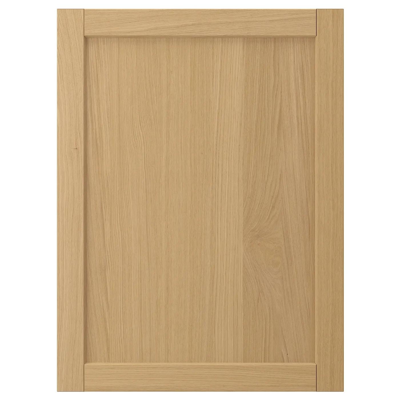 Фасады кухни FORSBACKA из теплого дубового шпона создают уютную атмосферу. Филенчатая дверь с фаской придает классический, традиционный вид.