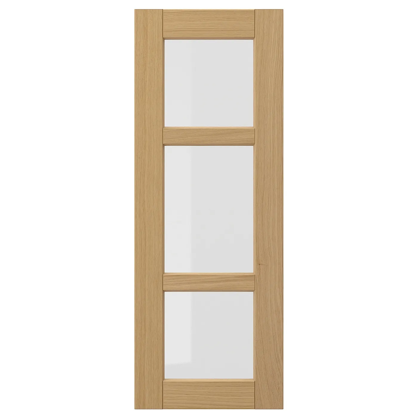 Кухонные фасады FORSBACKA из теплого дубового шпона создают атмосферу уюта и домашнего уюта. Рамка из стекла с фацетированными краями придает изделию классический, традиционный вид.