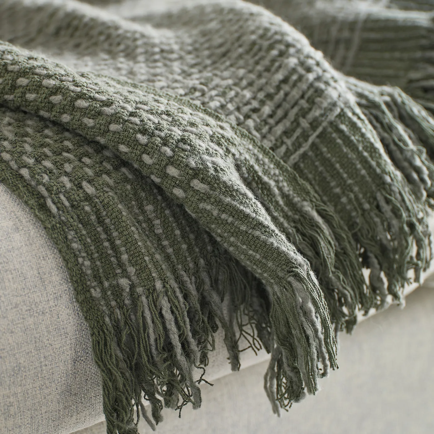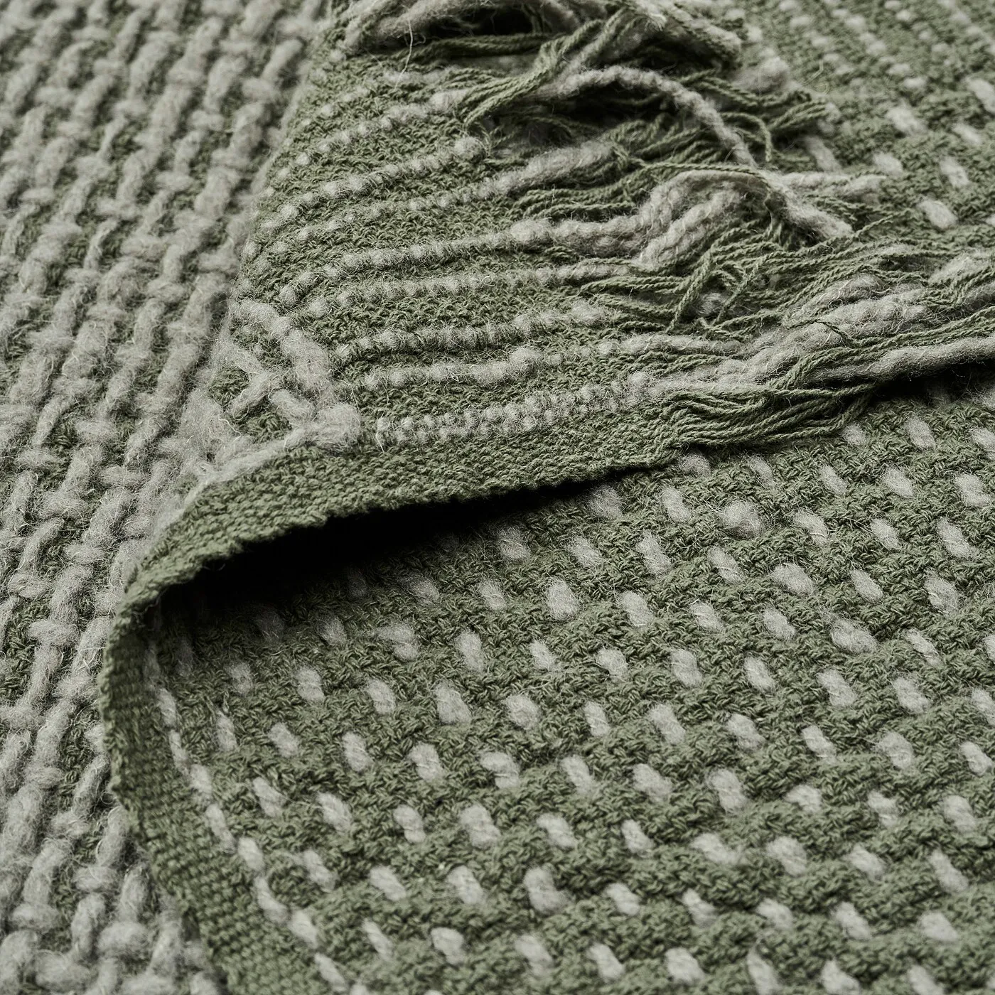 Ручная работа — плед в тёмно-серых и зелёных тонах. Одна сторона с большей долей шерсти для дополнительного тепла, другая с большинством хлопка для комфортной прохлады. Естественный вид и приятные на ощупь материалы.