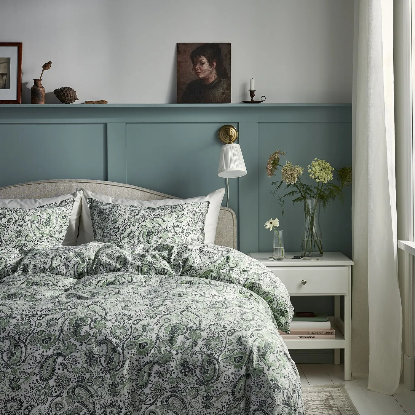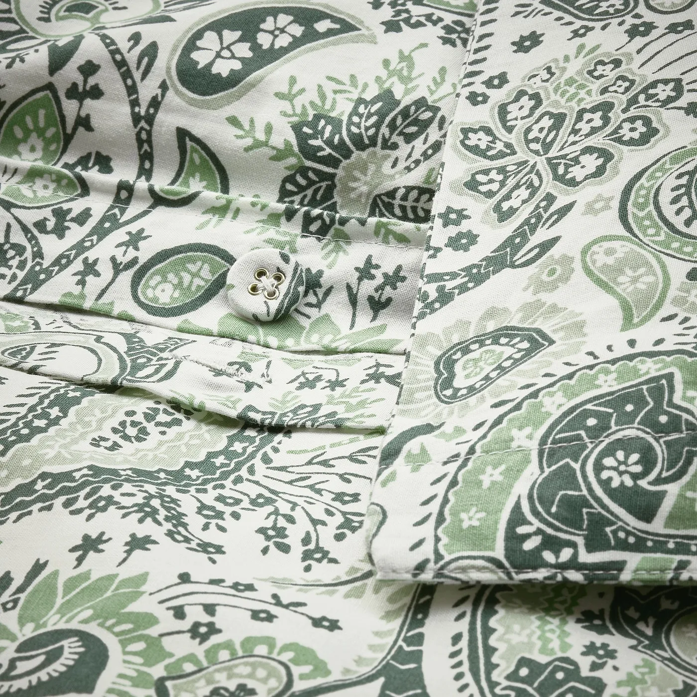 Decorative, fabric-covered buttons keep the duvet in place.