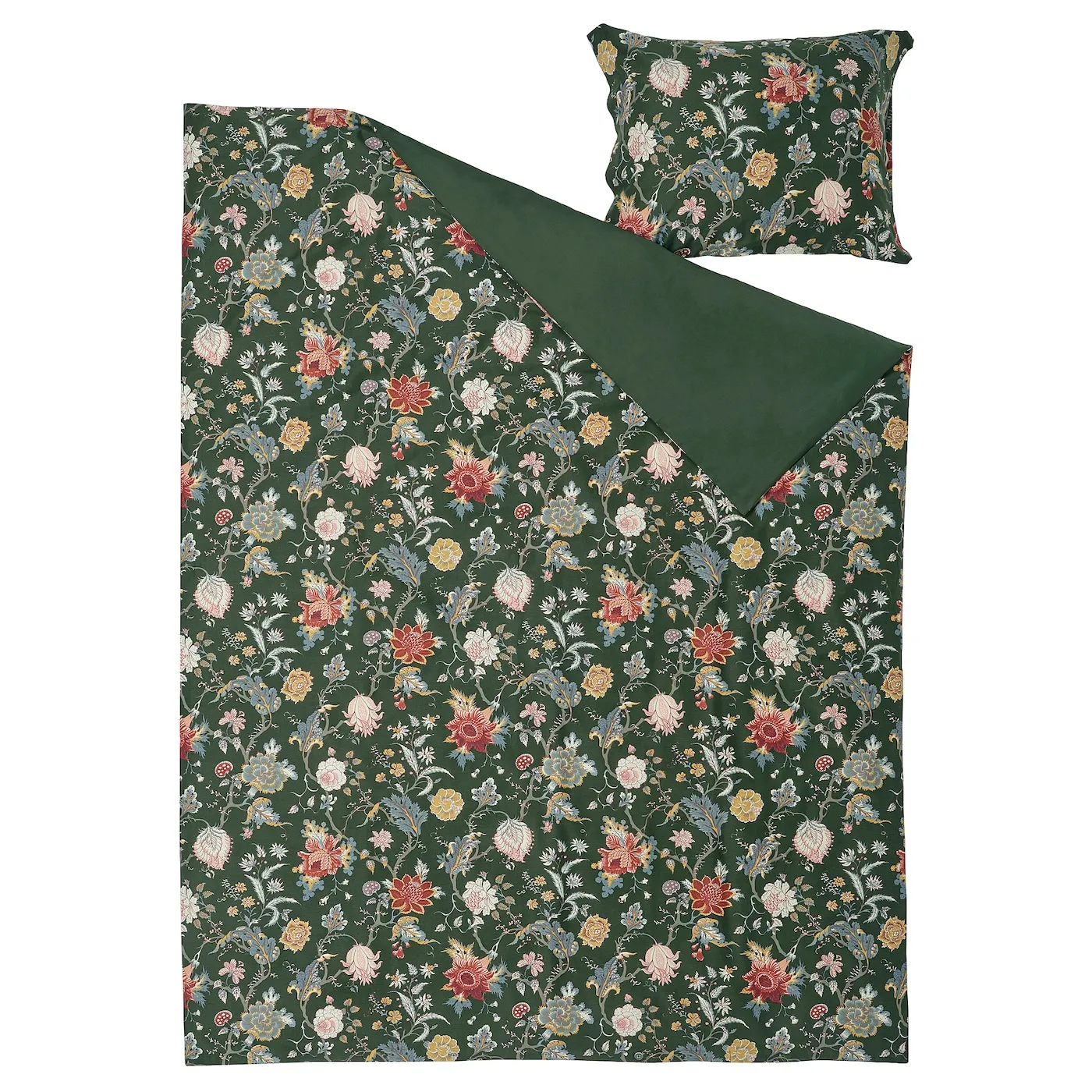 Сатиновое плетение с элегантным блеском придаст изысканности каждому дню. С одной стороны - цветочный орнамент, а с другой - однотонный темно-серо-зеленый. Мягкий на ощупь и дышащий благодаря смеси хлопка и вискозы материал.