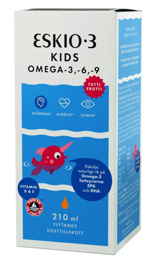 Эскио-3 Кидс Омега-3, -6, -9 Туттифруттидетский универсальный продукт с рыбьим жиром. Eskio-3 Kids имеет натуральный состав и богат омега-3, омега-6 (ГЛК) и омега-9 жирными кислотами, а также витамином D. Макуна туттурутти. Для детей 3-12 лет. Friend of The Sea сертифицирован и соответствует требованиям экологически чистых методов рыболовства и производства.