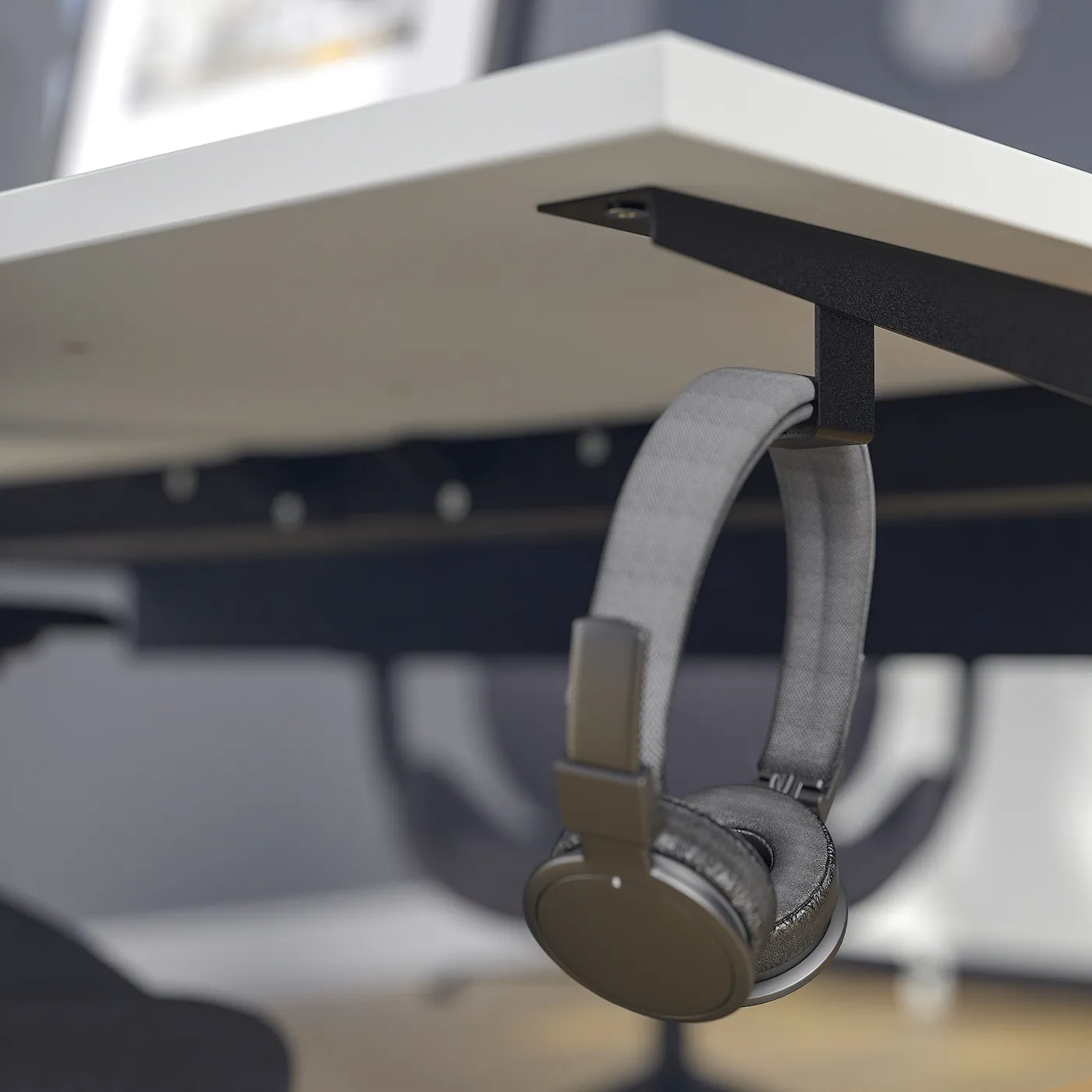 Каркас позволяет свободно двигать стул и ноги под столом, как сидя, так и стоя. Оснащен двумя крючками для наушников или сумок.