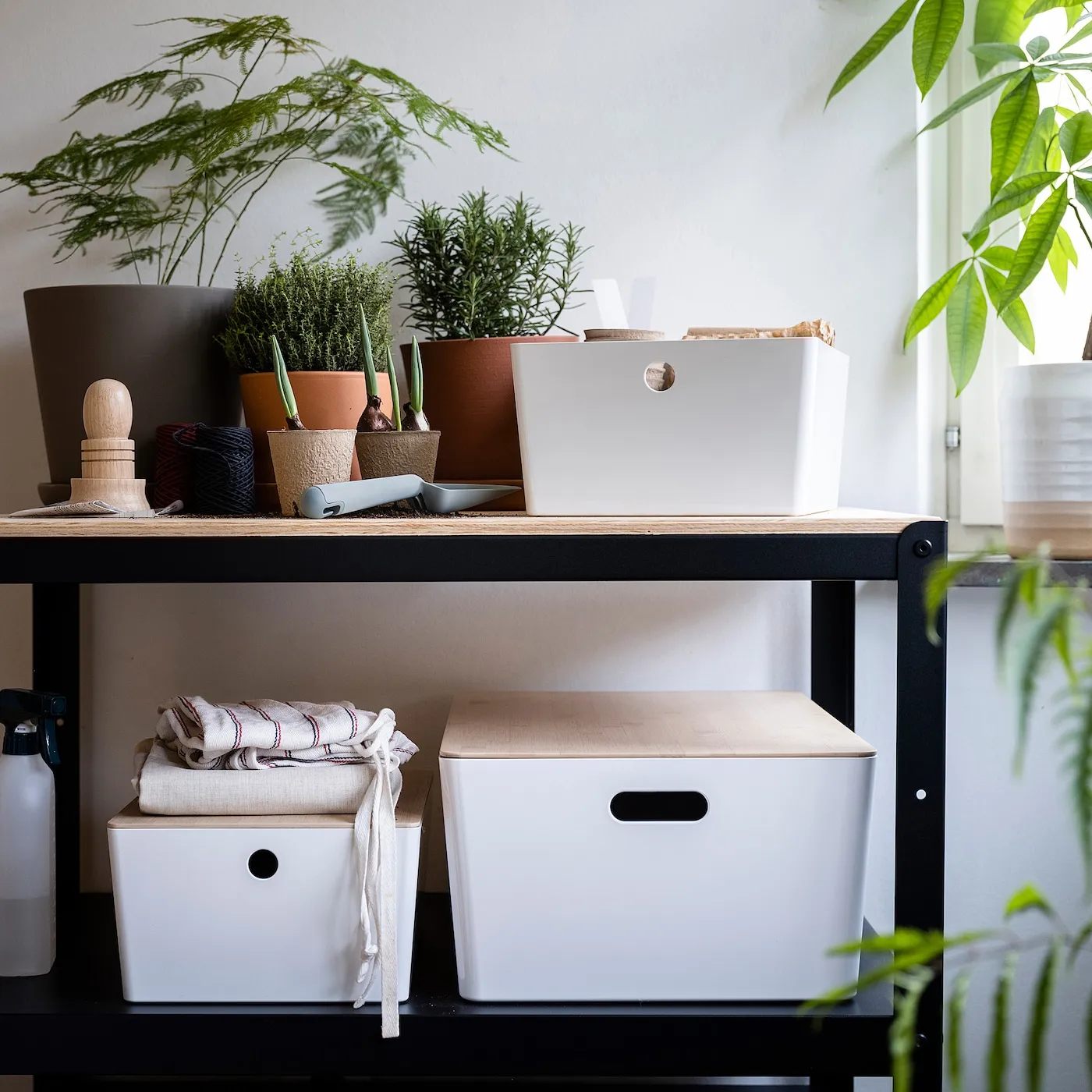 Дополнительная ручка на боковой стороне позволяет легко доставать коробку даже с неглубокой полки.