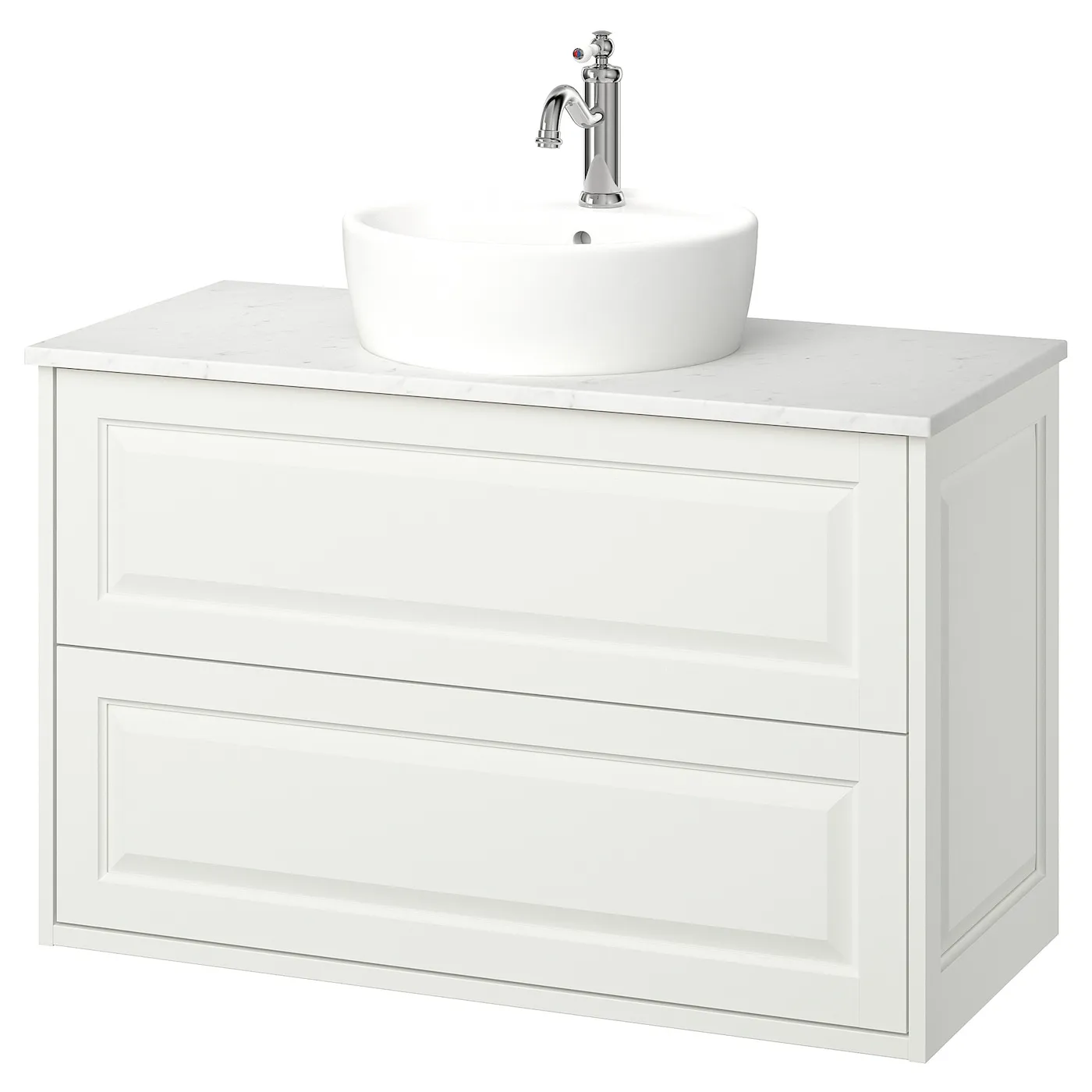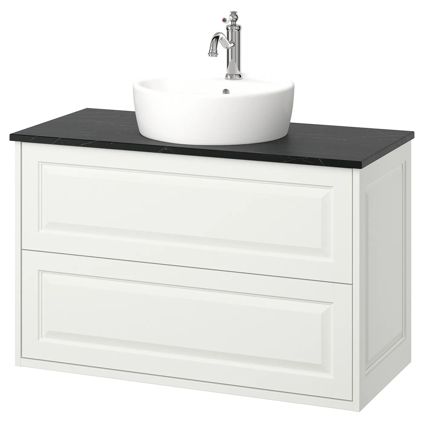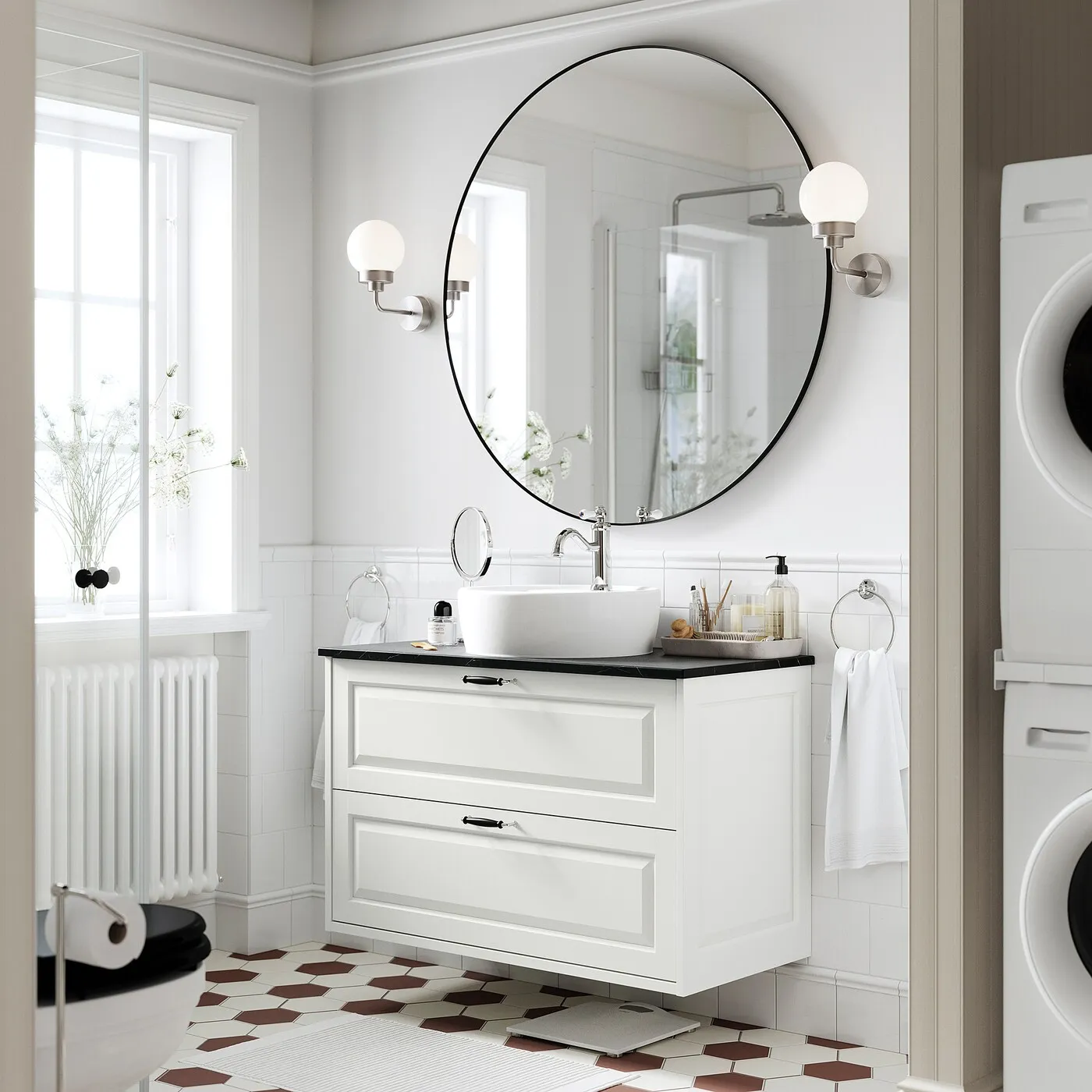 TÄNNFORSEN bathroom furniture expresses classic elegance with bevelled edges. This wash-stand with countertop and a round countertop wash-basin creates a personal bathroom centrepiece with a crafted look.