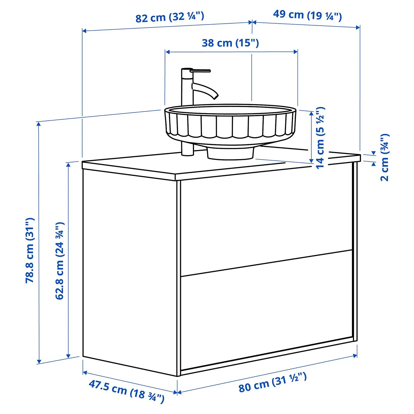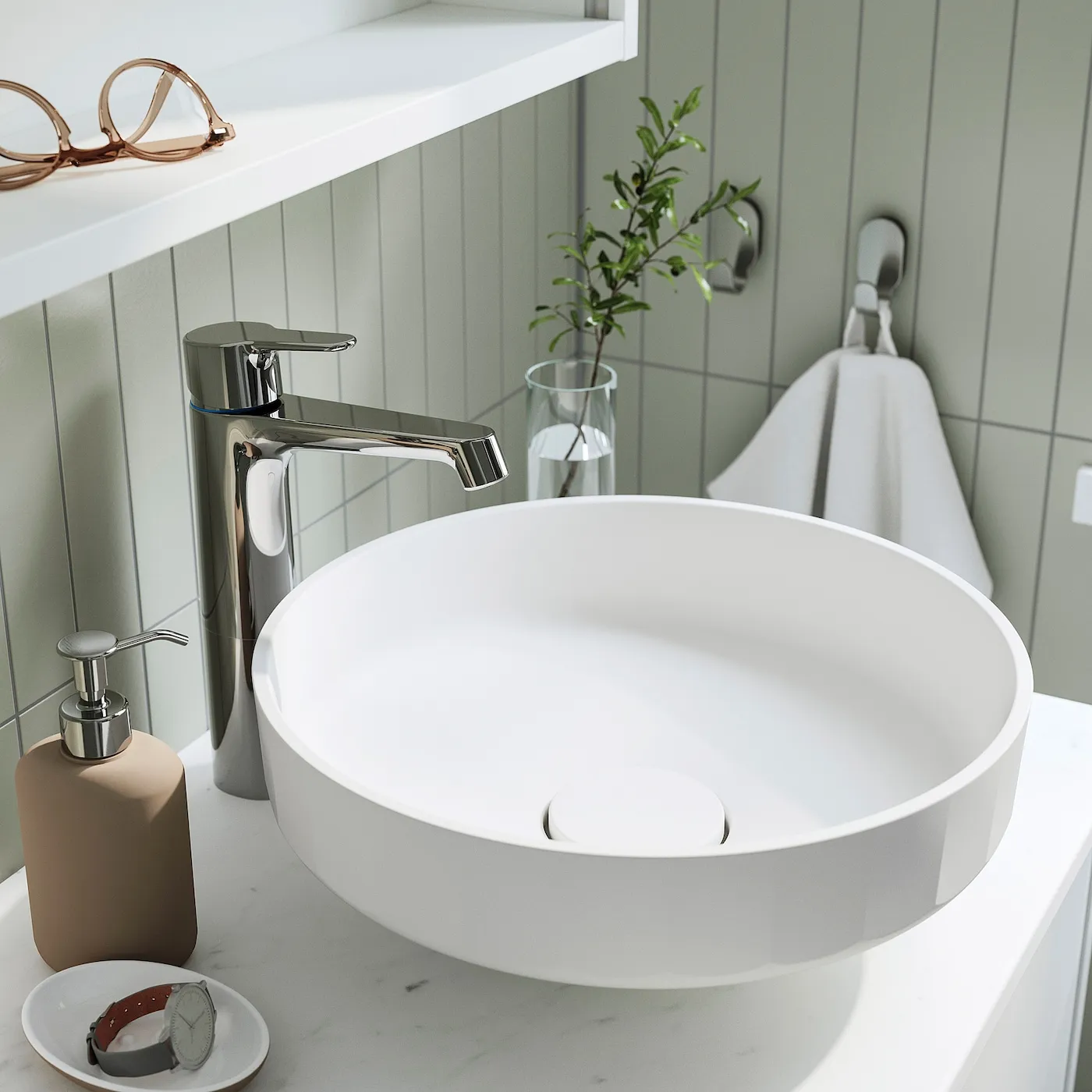 Мебель для ванной ÄNGSJÖN выглядит современно и стильно благодаря минимуму деталей. Эта тумба с круглой раковиной на столешнице станет стильным акцентом в вашей ванной комнате.