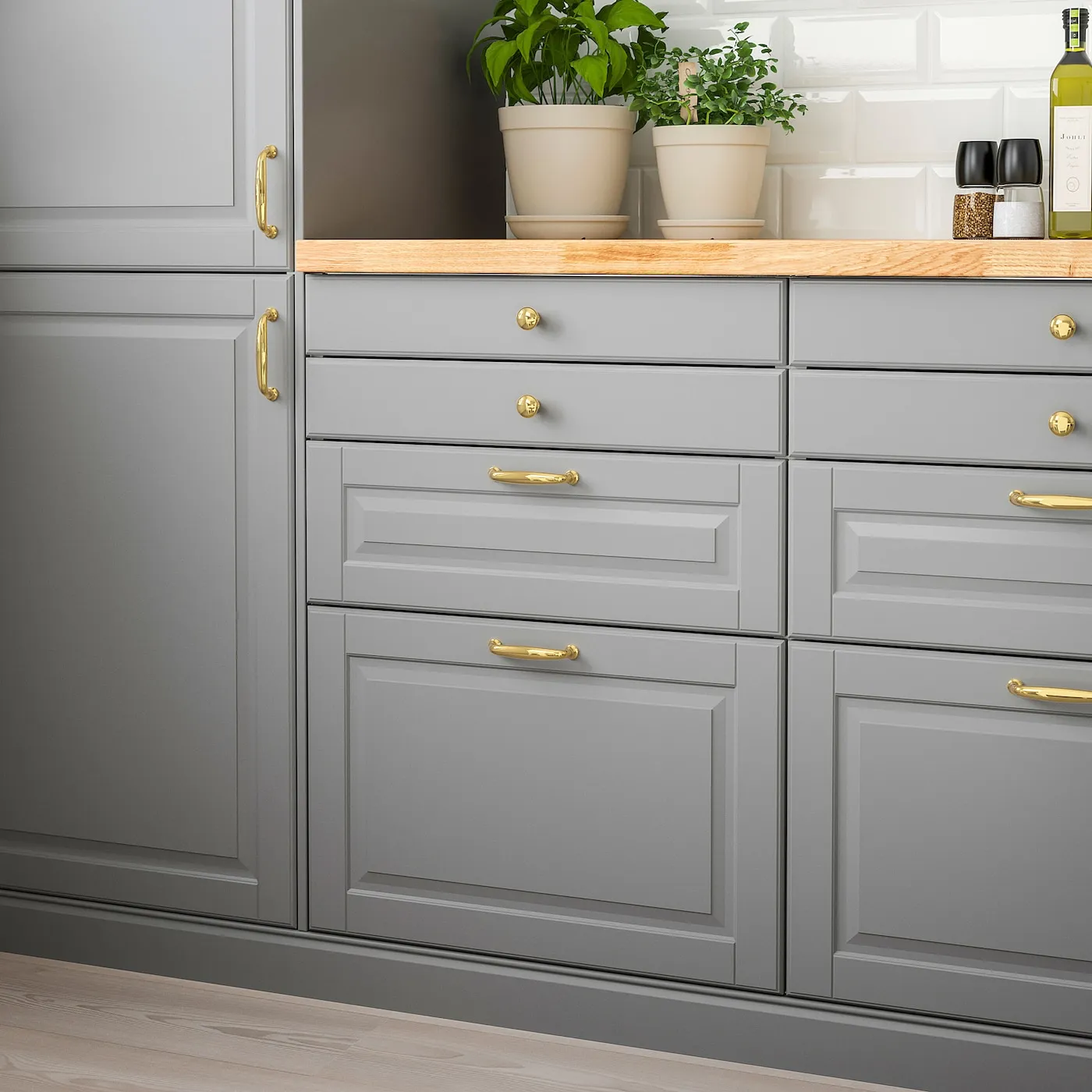 Дверь BODBYN имеет рамку и фаску, что придаёт ей выразительный, традиционный характер. Нежный серый цвет добавляет изысканности вашей кухне.