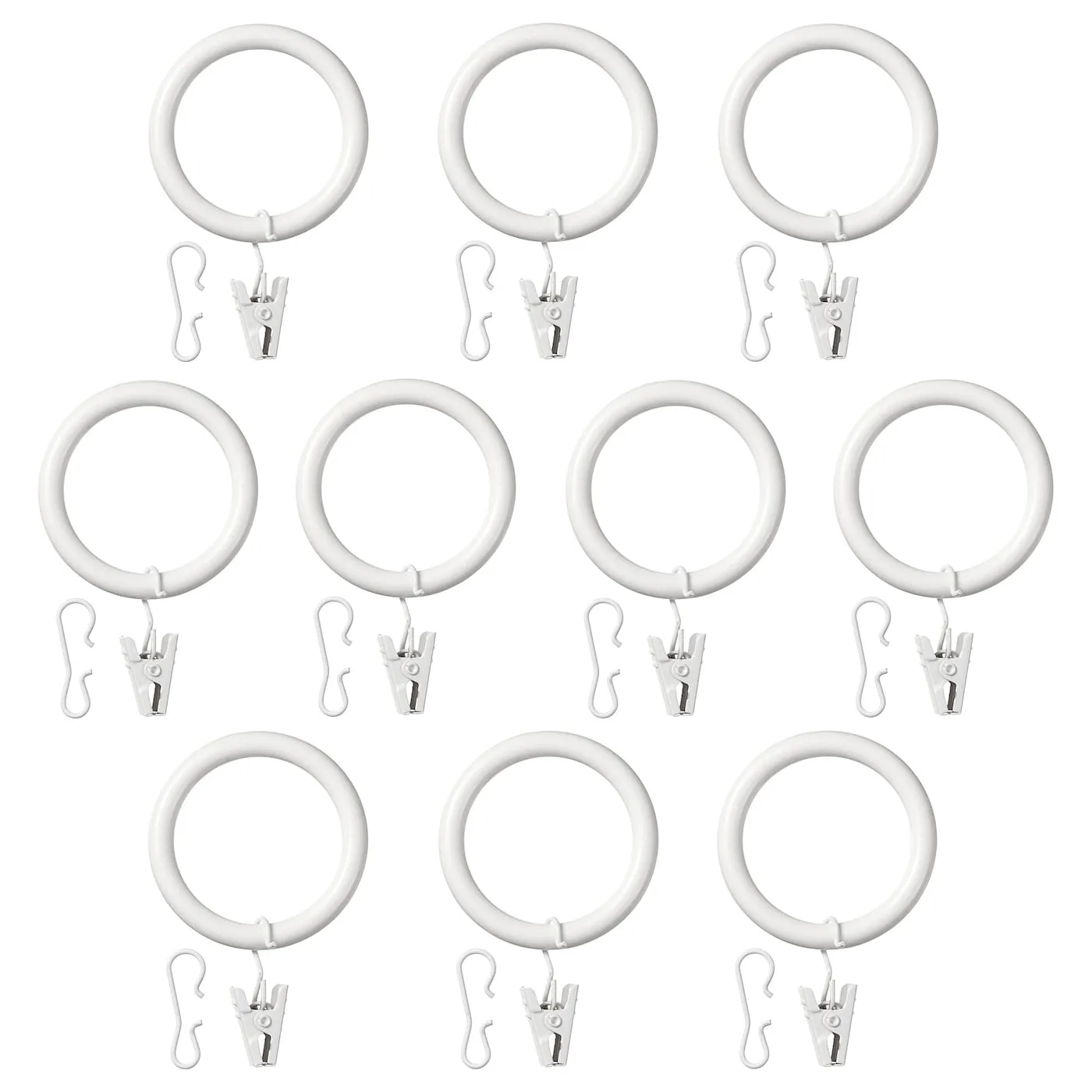 В комплект входит: 10 колец (диам. 38 мм), 10 клипс с крючками и 10 крючков.