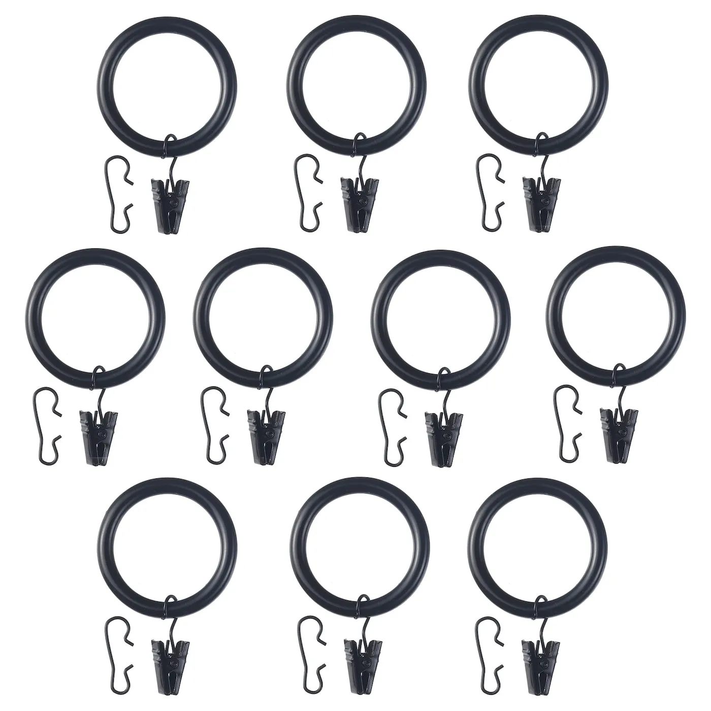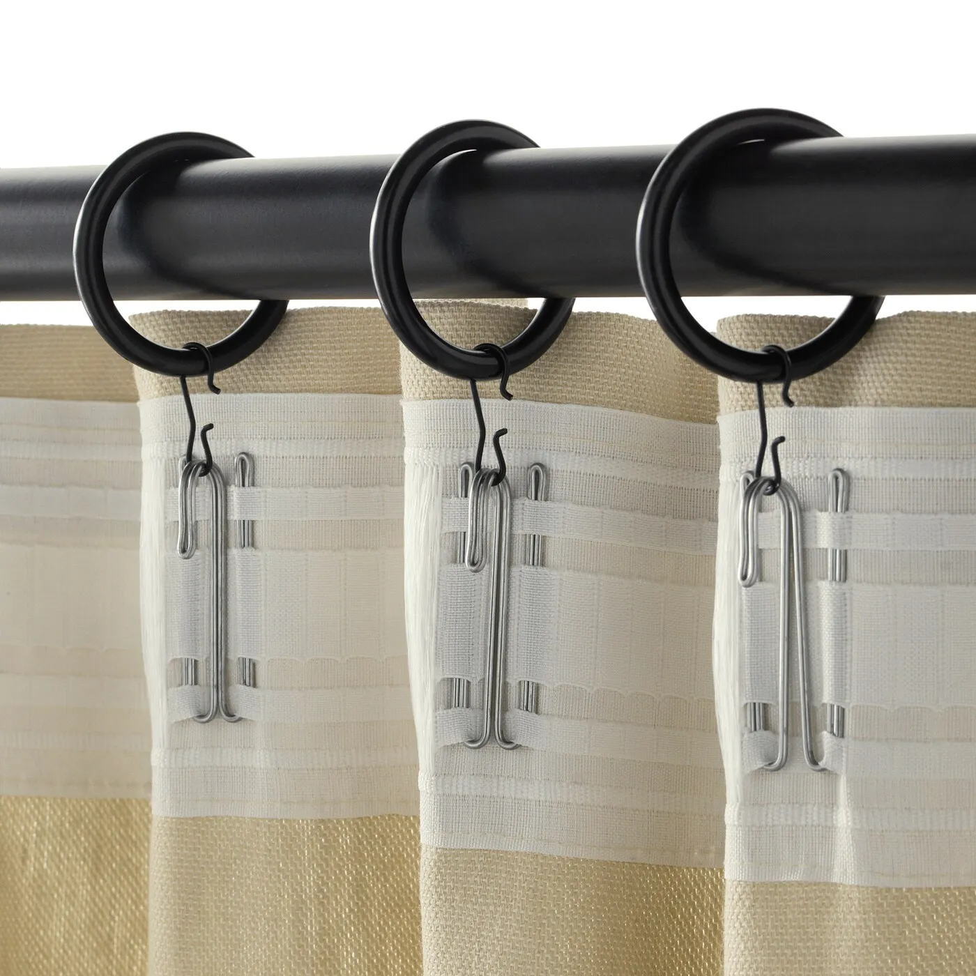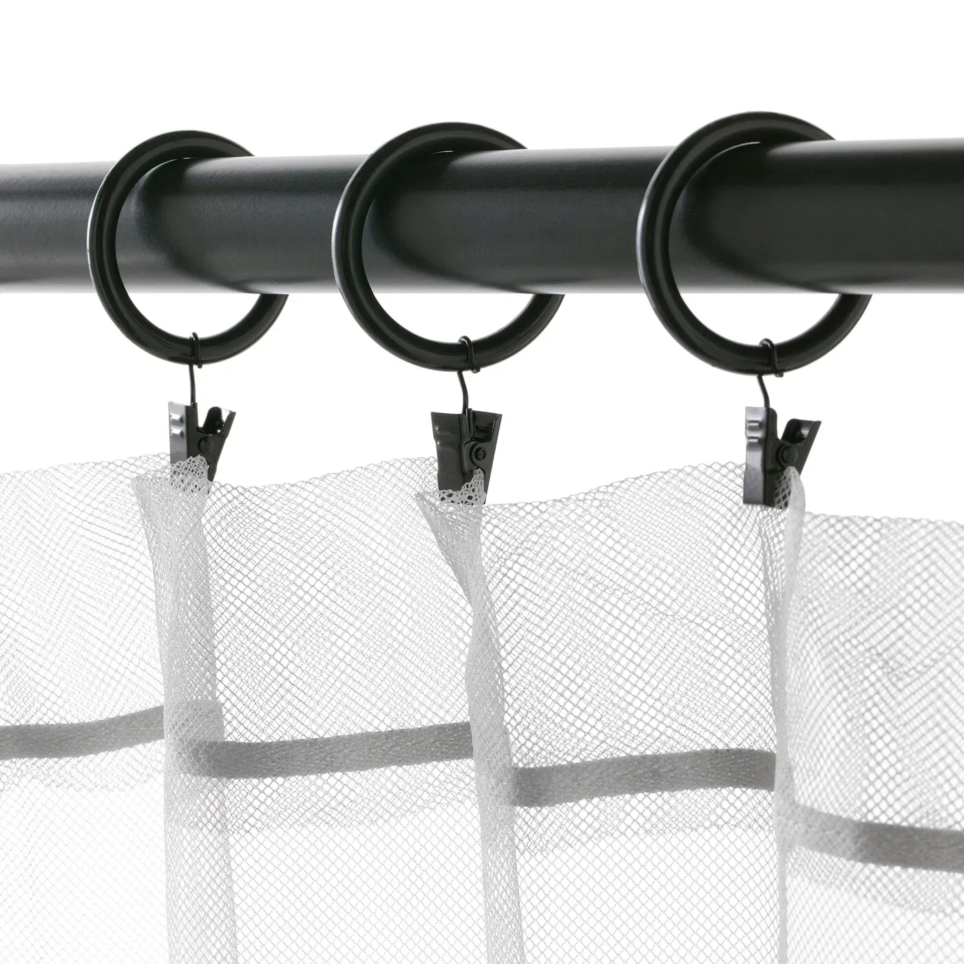 Эти черные кольца для штор легко скользят по карнизу. Вы можете крепить штору как с помощью клипс, так и крючков — все уже включено в комплект.