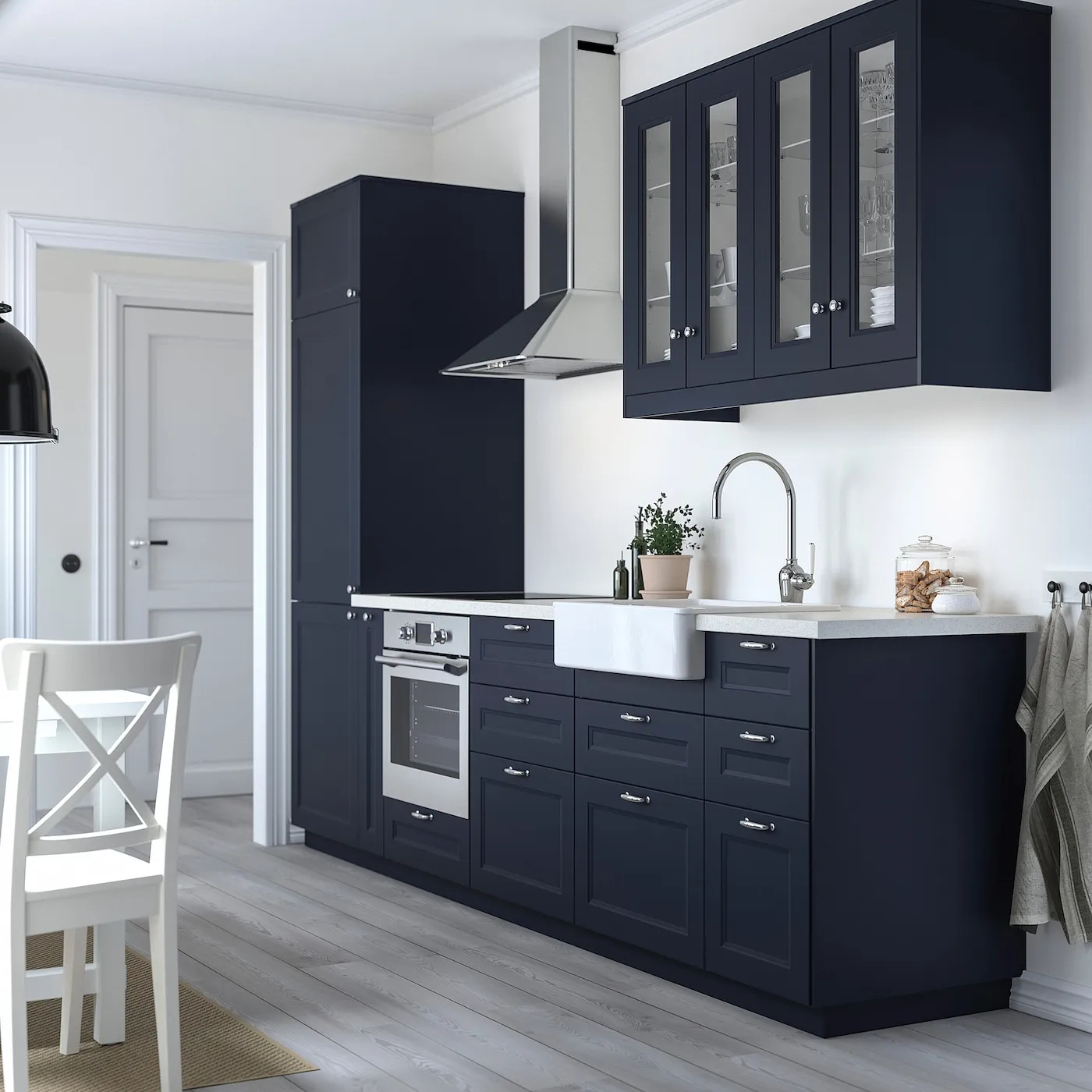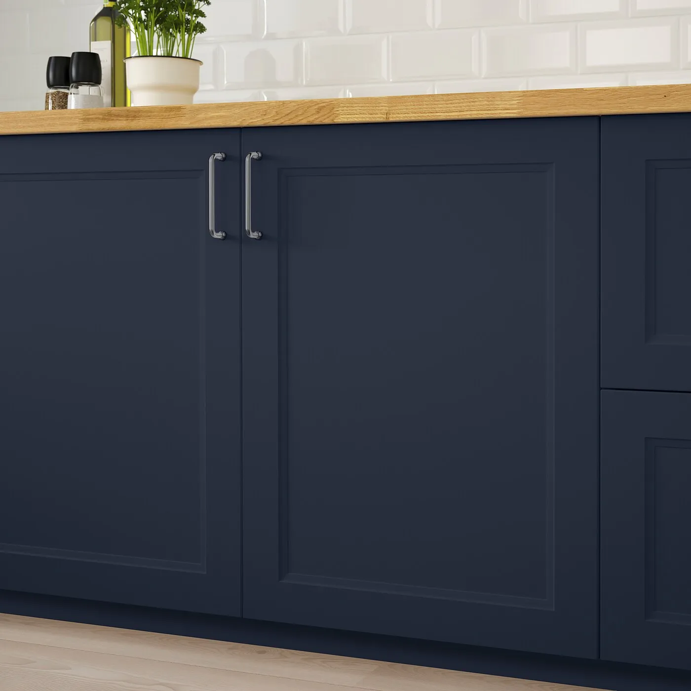 Кухонная дверца AXSTAD имеет матовую синюю поверхность с мягкими линиями и рамочной панелью. Этот дизайн позволяет создать как современный, так и традиционный стиль кухни.