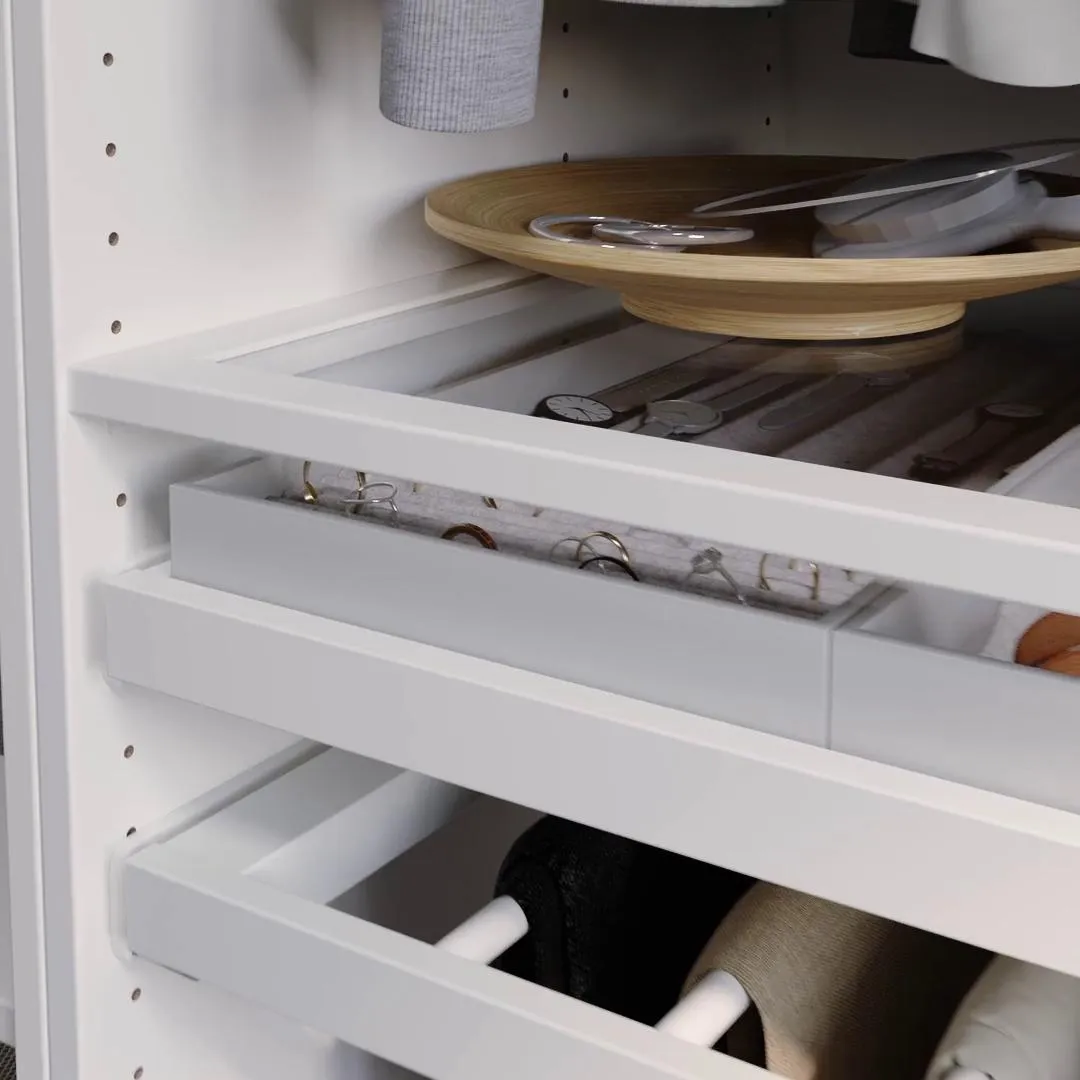 Можно дополнить вставками KOMPLEMENT, вставками для ювелирных изделий, перегородками и направляющими для обуви для выдвижного подноса, чтобы настроить хранение под себя.