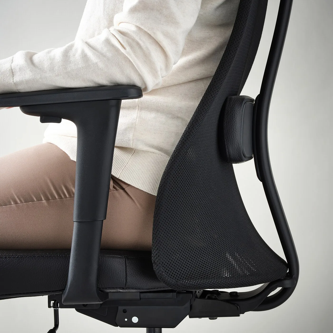 Регулируемая поясничная поддержка помогает поддерживать правильную осанку при сидении, уменьшая нагрузку на мышцы нижней части спины.