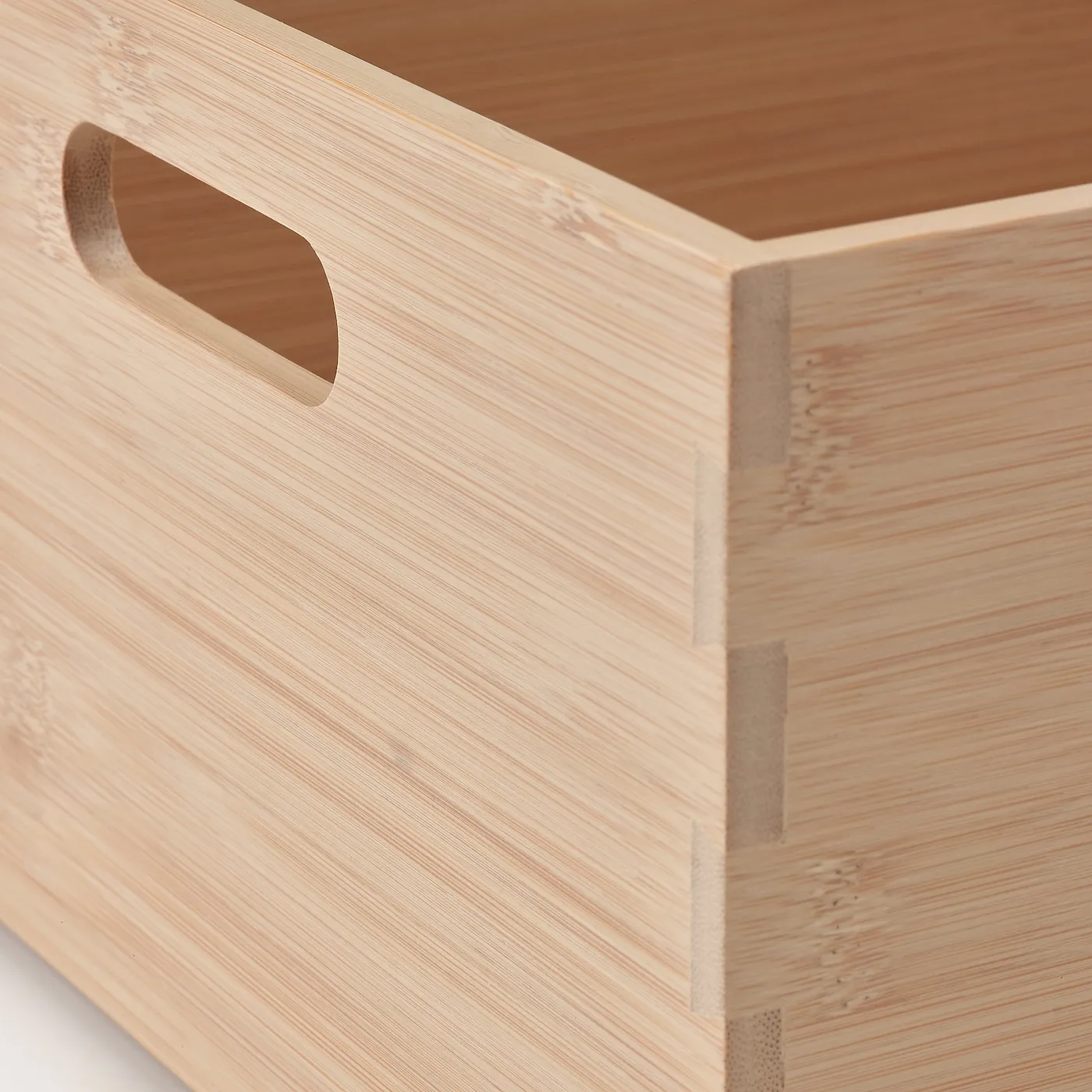 Этот ящик из бамбука одновременно украшает интерьер и выполняет практическую роль. Он отлично вписывается на полке или в глубоком ящике. Подходит для кухонных принадлежностей и баночек с пряностями или для хранения мелочей в прихожей.