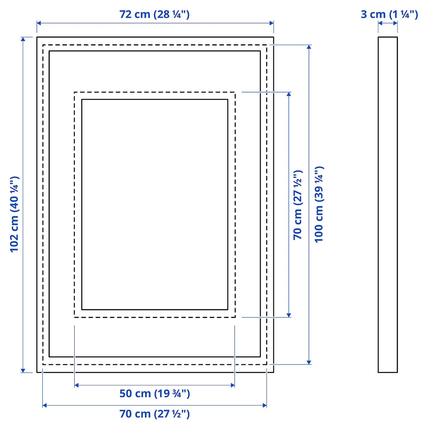 Эта рамка подходит для изображения размером 50x70 см при использовании с паспарту и для изображения 70x100 см без него.