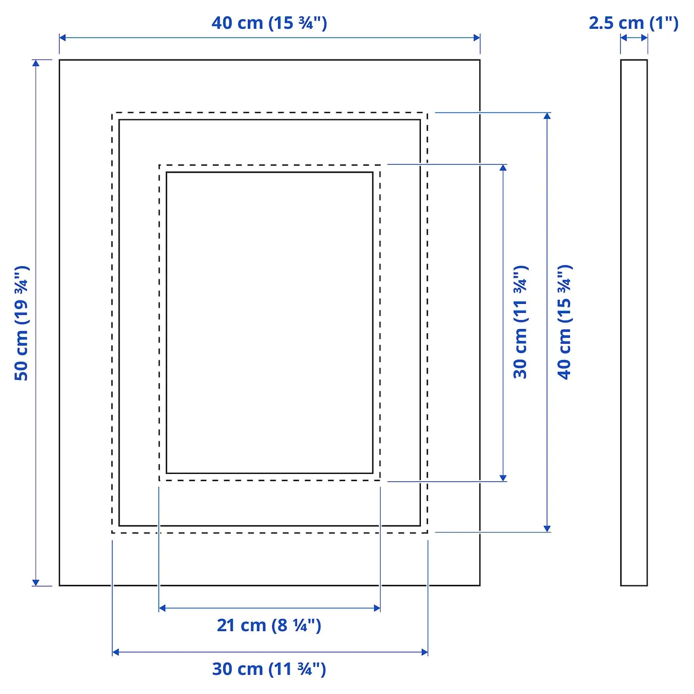 Эта рама подходит для фотографии размером 21x30 см, если используется с подкладкой, и для фотографии размером 30x40 см, если используется без неё.