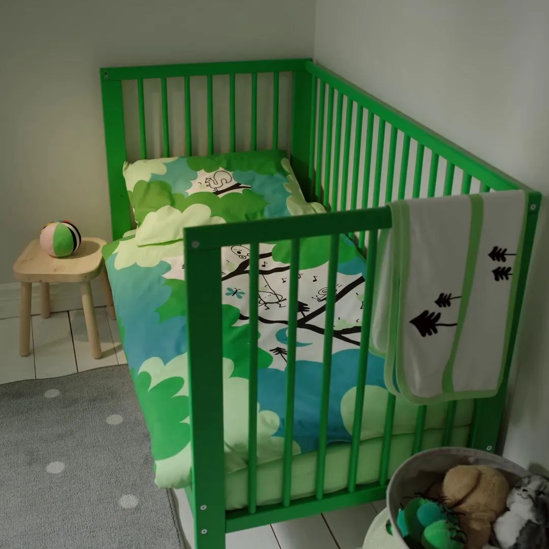 Забавные фигурки прячутся среди деревьев на этом комплекте постельного белья из мягкого хлопка и вискозы, которые с удовольствием составят компанию вашему малышу и подходящей простыни на резинке в кроватке. Кто знает, что они затеют, когда свет потухнет?