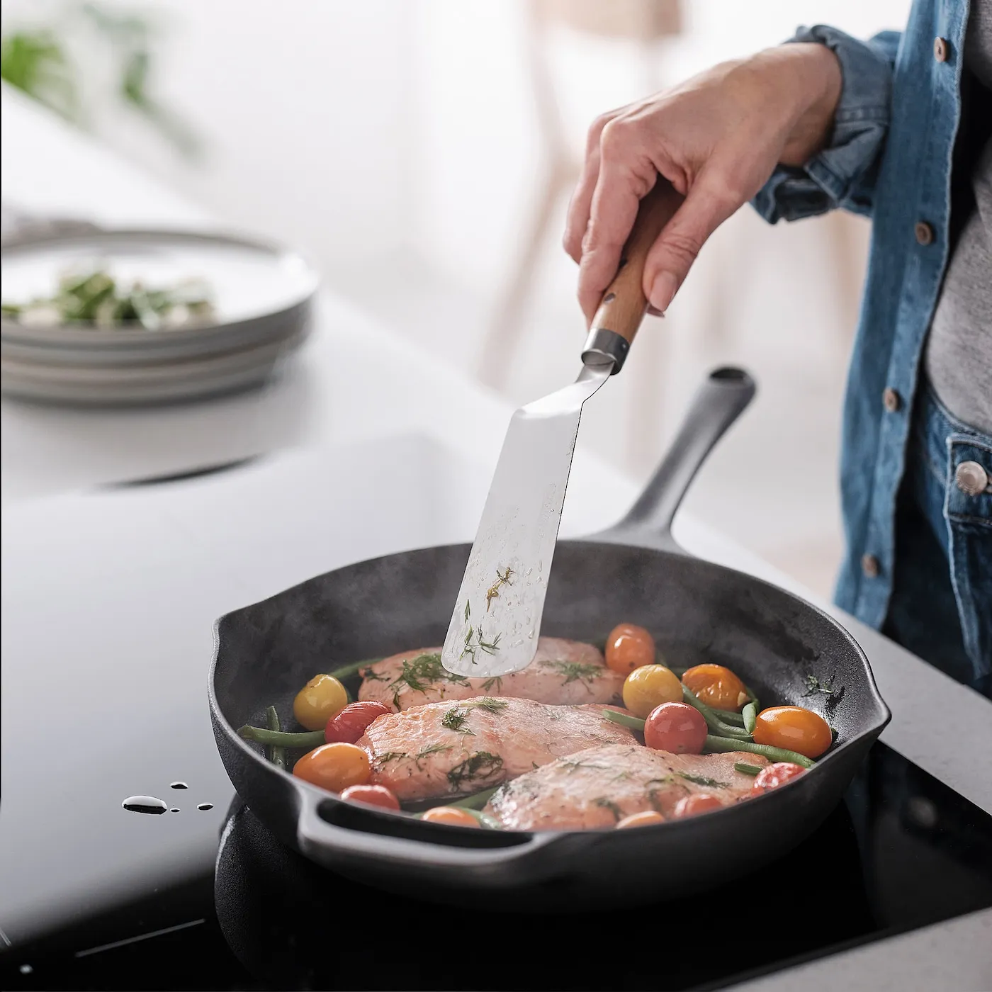 Тонкий изогнутый край легко скользит под продуктами, что упрощает переворачивание таких блюд, как блины, гамбургеры и яйца.