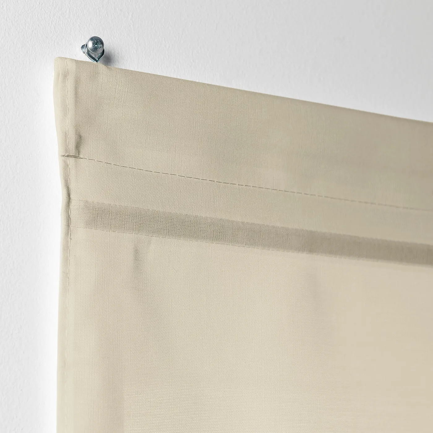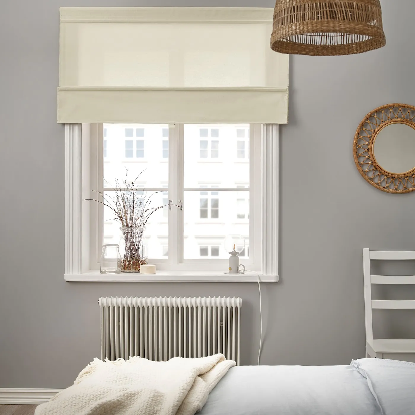 Римская штора RINGBLOMMA бежевого цвета с элегантной льняной текстурой. Ткань фильтрует свет и создает уютную атмосферу. Подходит для стирки и идеальна для любого помещения, включая кухни и ванные комнаты. Поднимается и опускается при помощи магнитов.