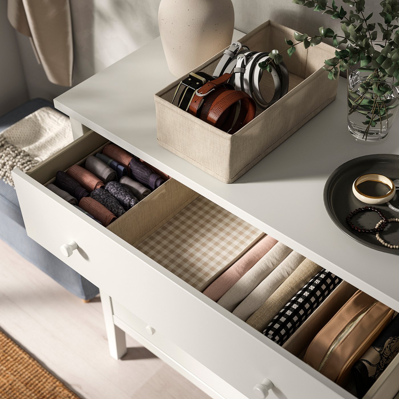 Высокие сужающиеся ножки создают легкое и воздушное впечатление — и облегчают уборку под комодом.