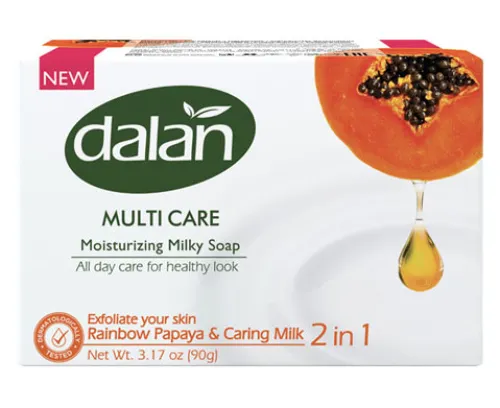 Dalan Multi Care Увлажняющее Туалетное мыло с экстрактом папайи — это идеальное средство для ежедневного ухода за кожей. Упаковка весом 90 г удобно помещается в руках и отлично подходит для использования как дома, так и в поездках.