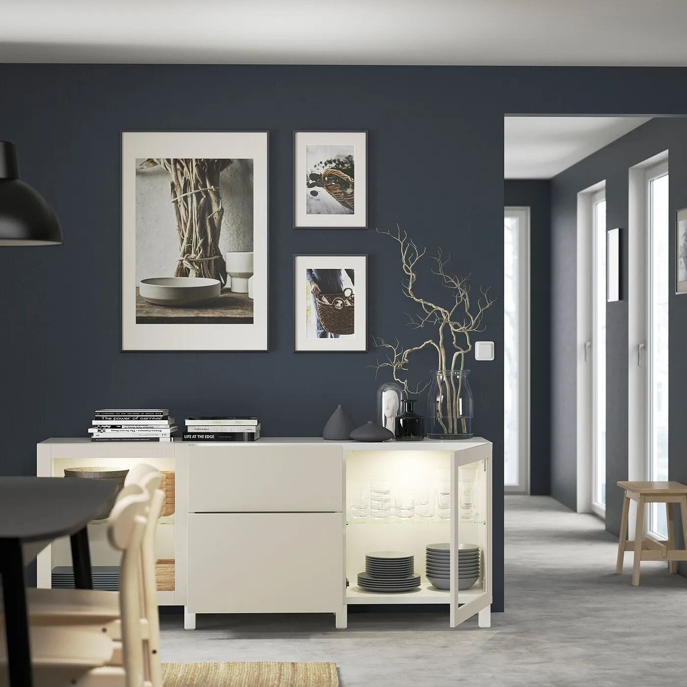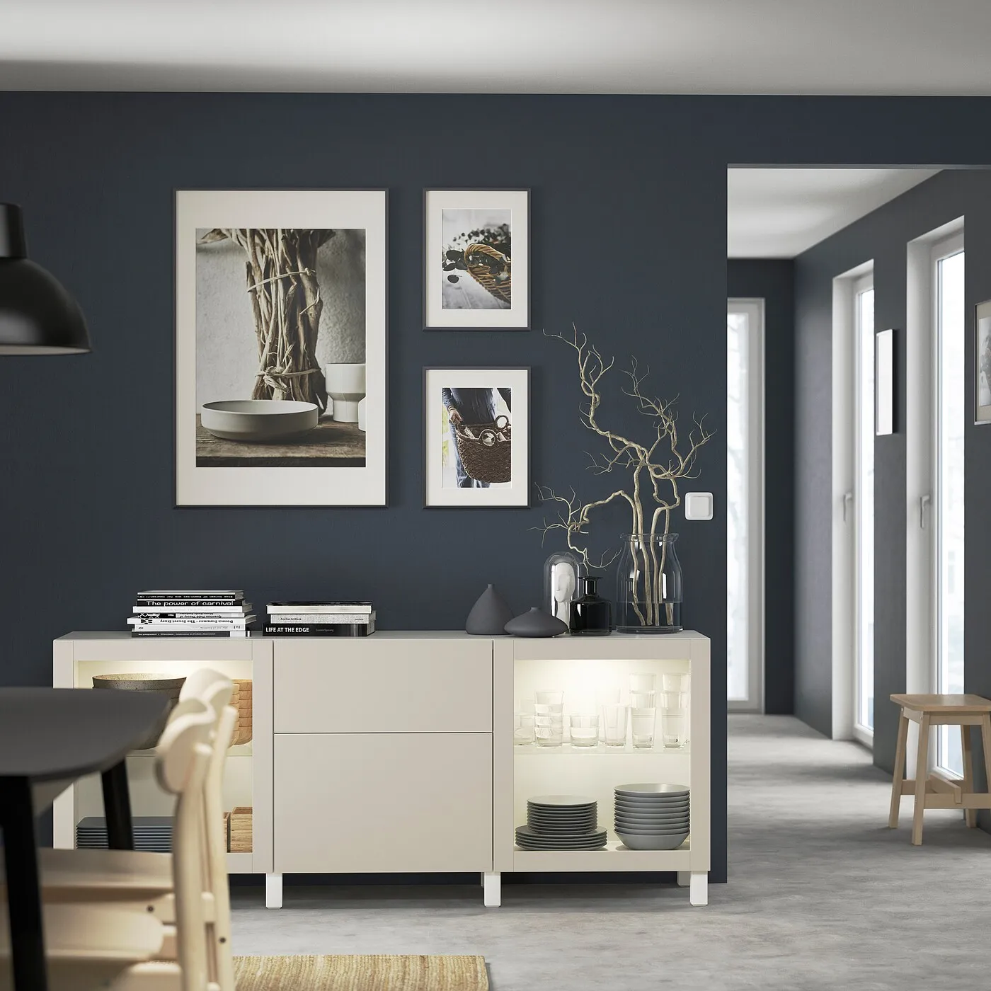 Эта комбинация состоит из нескольких отдельных элементов. Используйте верхнюю панель BESTÅ, продается отдельно, чтобы скрыть стыки между рамами и создать единый вид.
