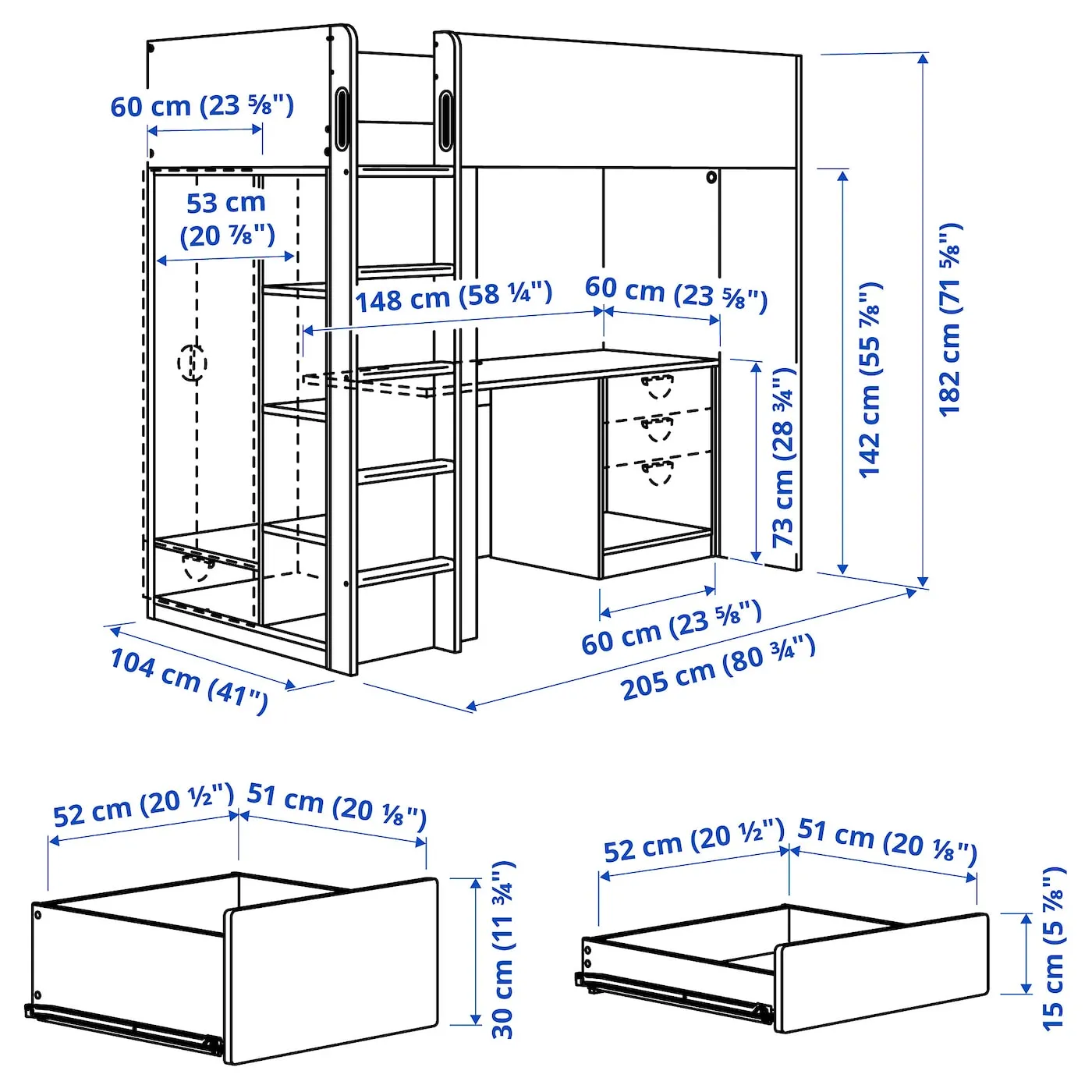 Умная комбинация включает кровать-чердак, стол с ящиками, шкаф с ящиком и книжную полку.