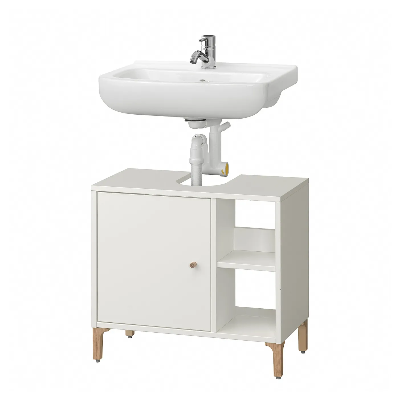 В комплект входит: 1 тумба под умывальник, 1 дверца для тумбы, 1 умывальник, 1 смеситель, 1 сифон с пробкой и 2 ручки.