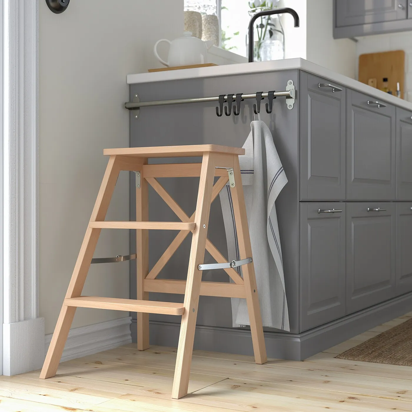 Хранить вещи на высоте – это удобно, но не всегда получается до них добраться. Эта стремянка делает легче доступ к верхним полкам шкафов – и выглядит она при этом стильно.